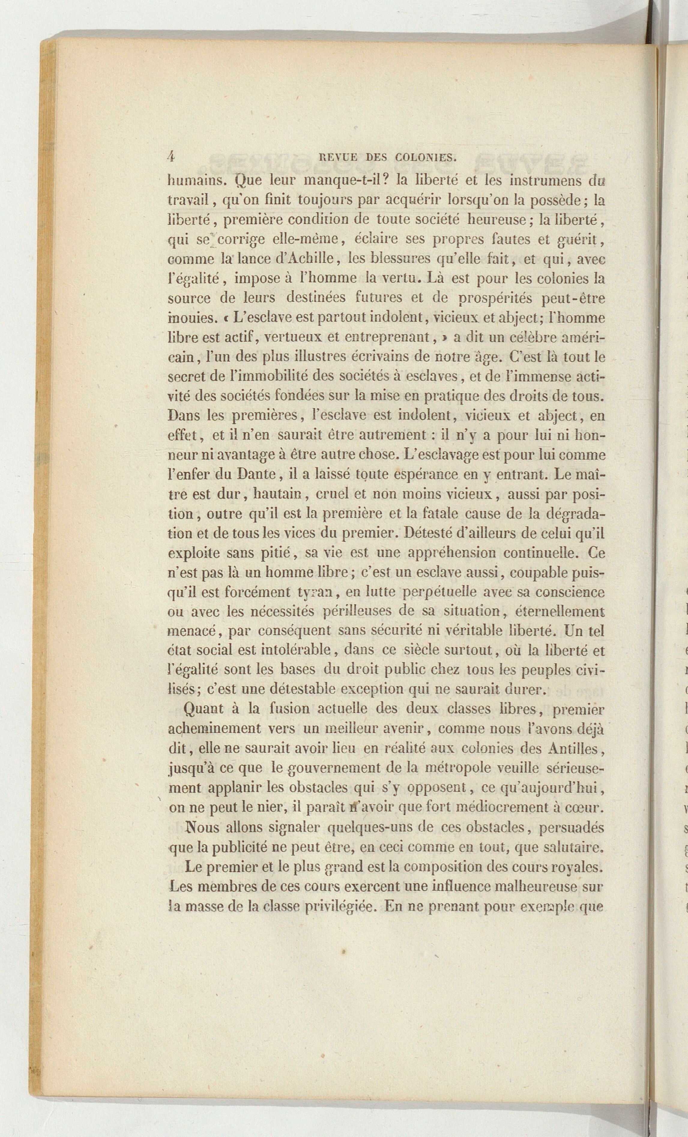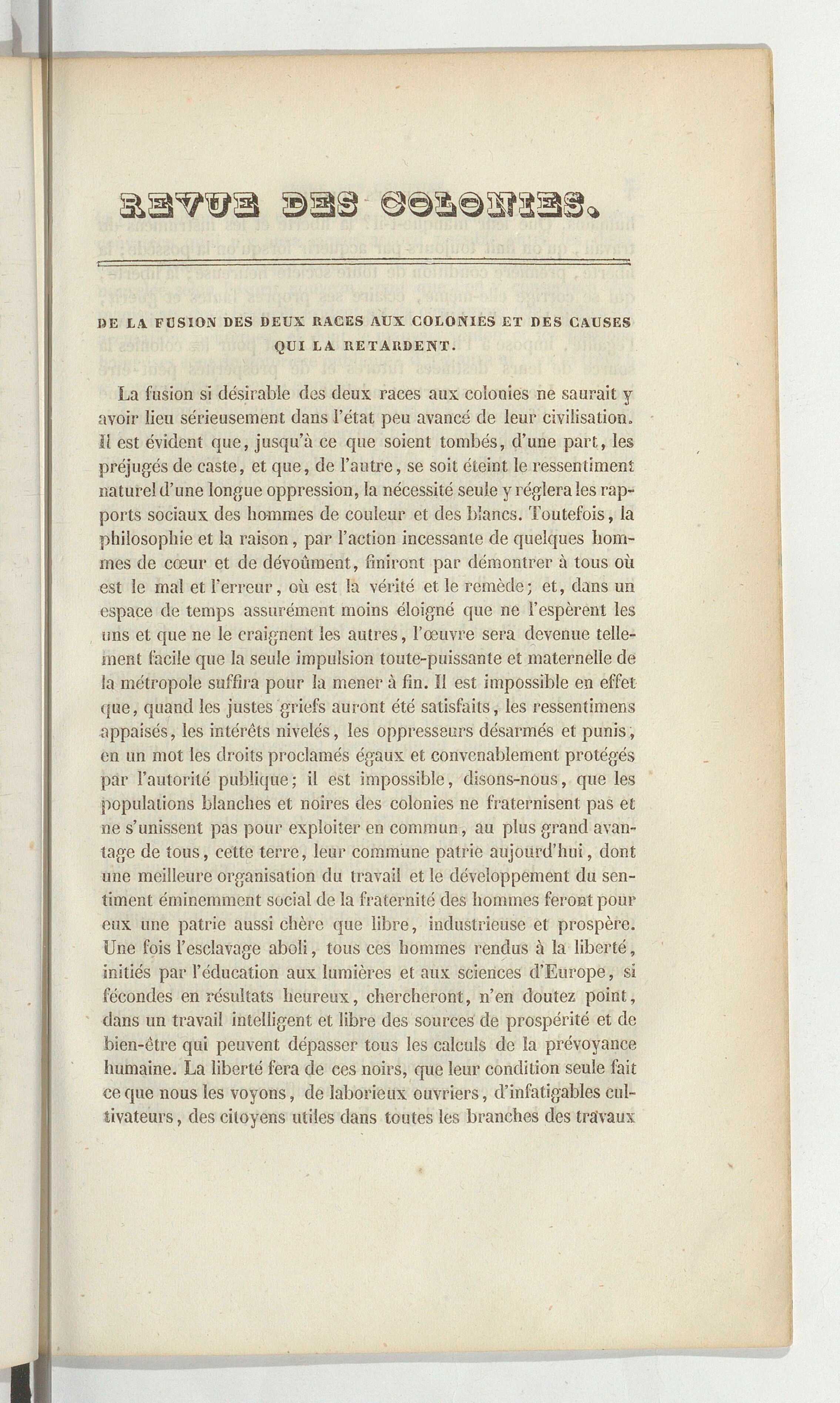 REVUEDES COLONIESON THE FUSION OF THE TWO RACES IN THE COLONIES AND THE CAUSES THAT DELAY IT.The much-to-be-desired fusion of the two races in the colonies cannot truly take place there, given the still little advanced state of their civilization. It is evident that, until, on the one hand, caste prejudices have fallen, and, on the other, the natural resentment born of long oppression has been extinguished, necessity alone will regulate the social relations between men of color and whites. Nevertheless, philosophy and reason, through the unceasing action of a few men of heart and of devotion, will end by showing everyone where evil and error lie, and where truth and remedy are; and, within a span of time surely less distant than some hope and others fear, the work will have become so easy that the all-powerful, maternal impulse of the metropolis alone will suffice to bring it to completion. For it is indeed impossible that, once just grievances have been satisfied, resentments appeased, interests leveled, oppressors disarmed and punished—in a word, rights proclaimed equal and suitably protected by public authority—it is impossible, we say, that the white and Black populations of the colonies should not fraternize and unite in order to cultivate together, to the greatest advantage of all, that land—today their common fatherland—of which a better organization of labor and the development of the eminently social sentiment of human fraternity will make for them a homeland as dear as it is free, industrious, and prosperous. Once slavery is abolished, all these men restored to freedom, initiated through education into the lights and sciences of Europe, so fertile in happy results, will seek—make no doubt of it—in intelligent and free labor sources of prosperity and well-being that may surpass all the calculations of human foresight. Freedom will make of these Blacks, whom their condition alone makes what we see, hardworking laborers, indefatigable cultivators, useful citizens in every branch of