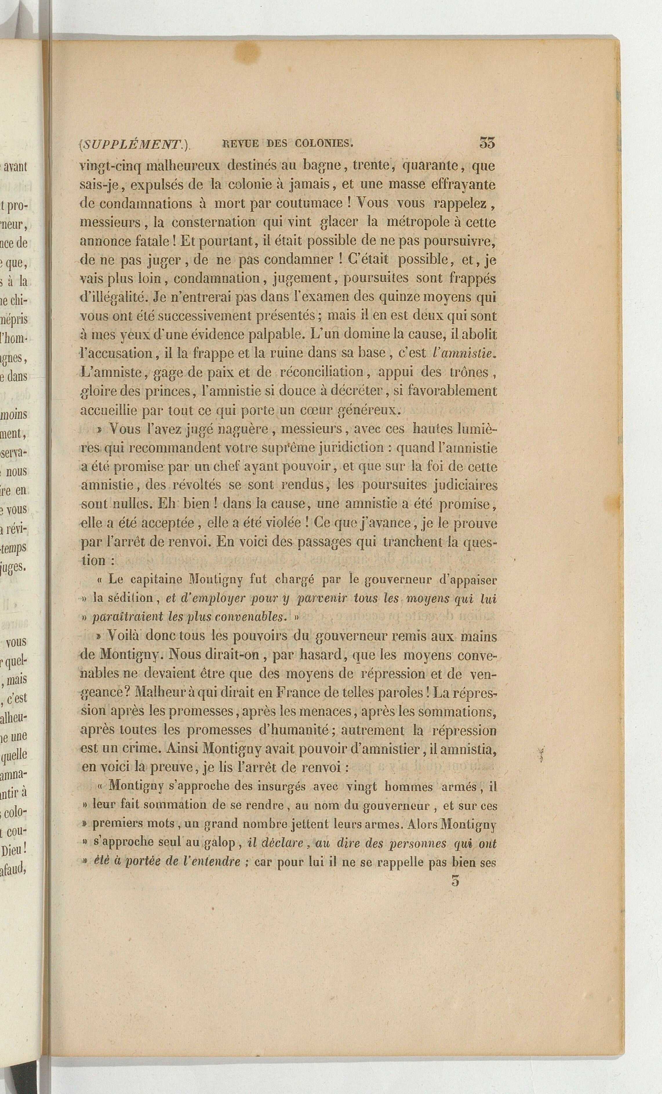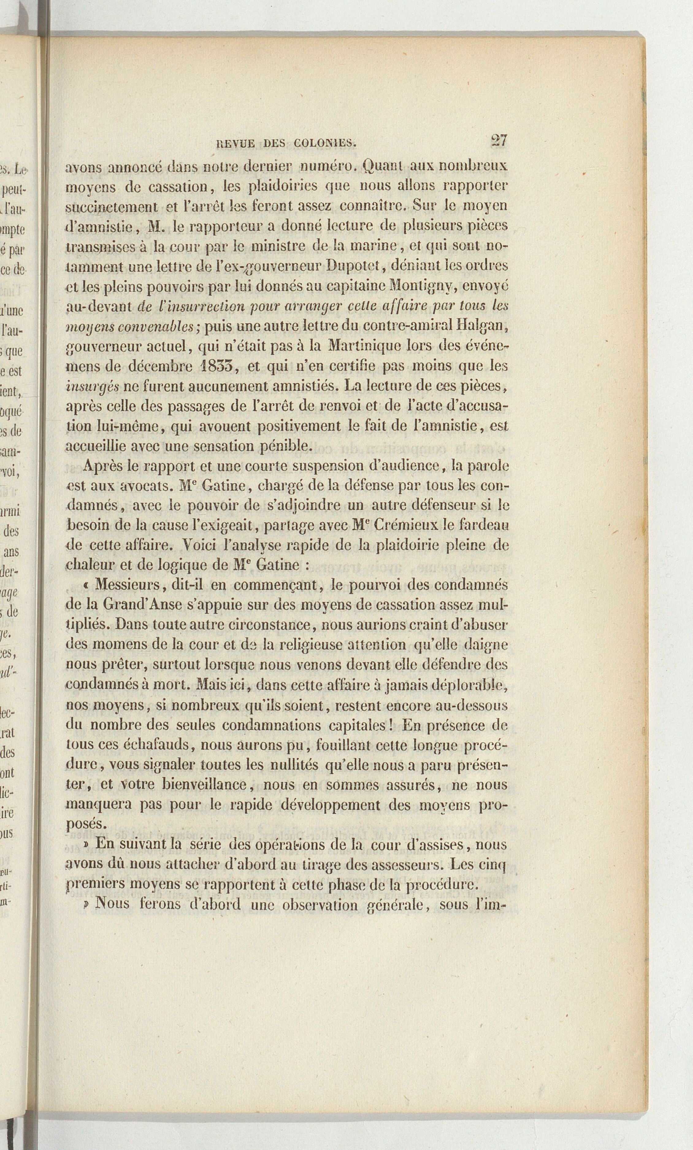 announced in our last issue. As for the numerous grounds for cassation, the pleadings that we shall report succinctly and the judgment will make them sufficiently known. On the ground of amnesty, the rapporteur read several documents transmitted to the court by the Minister of the Navy, including in particular a letter from the former governor Dupotet, denying the orders and full powers he had given to Captain Montigny, sent to meet the insurrection in order to settle this matter by all suitable means; then another letter from Rear-Admiral Halgan, the current governor, who was not in Martinique at the time of the events of December 1833, and who nonetheless certifies that the insurgents were in no way amnestied. The reading of these documents, after that of the passages from the committal decision and from the indictment itself, which positively acknowledge the fact of the amnesty, is received with a painful sensation.After the report and a brief suspension of the hearing, the floor is given to counsel. Mr Gatine, charged with the defense by all the condemned, with the power to associate another defender with him if the needs of the case required it, shares with M Crémieux the burden of this matter. Here is a rapid analysis of the pleading, full of warmth and logic, by Me Gatine: ““Gentlemen,” he says as he begins, “the appeal of the condemned of Grand'Anse rests on fairly numerous grounds for cassation. In any other circumstance, we would have feared abusing the moments of the court and the reverent attention it deigns to grant us, especially when we come before it to defend men sentenced to death. But here, in this forever deplorable affair, our grounds, however numerous they may be, still remain fewer than the number of capital sentences alone. In the presence of all these scaffolds, by probing this long procedure, we may have been able to point out to you all the nullities that it seemed to present, and your benevolence, we are assured, will not fail us for the rapid development of the proposed grounds.”” ““In following the series of operations of the assize court, we had first to address the drawing of the assessors. The first five grounds relate to this phase of the procedure.”” ““We shall first make a general observation, under the im