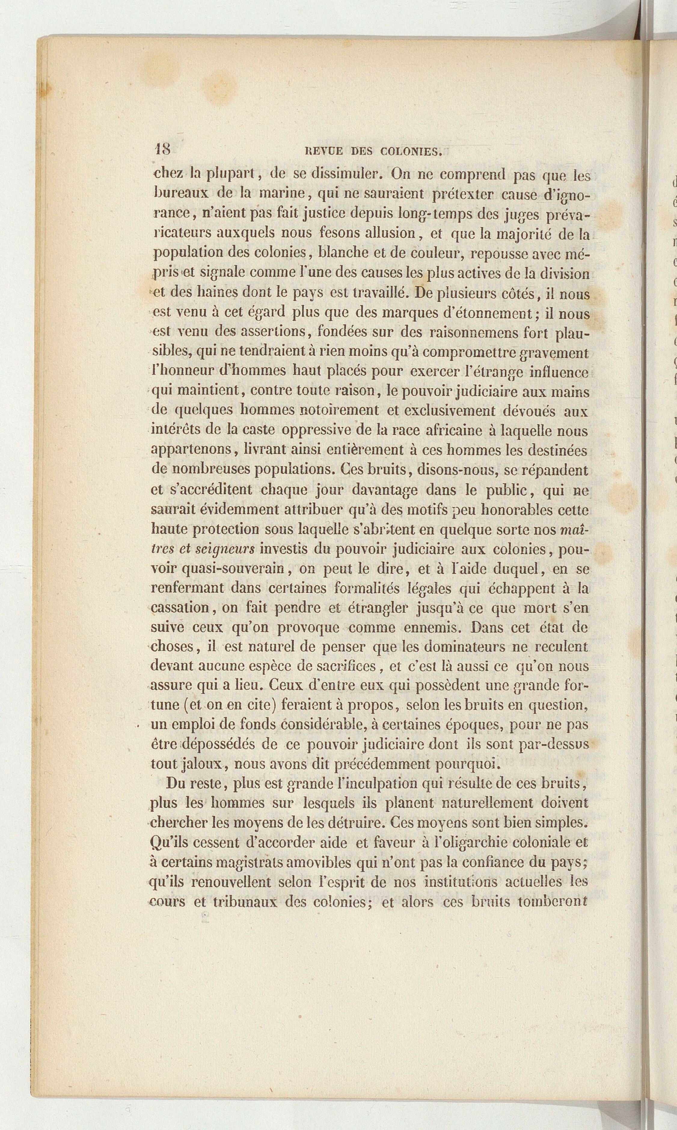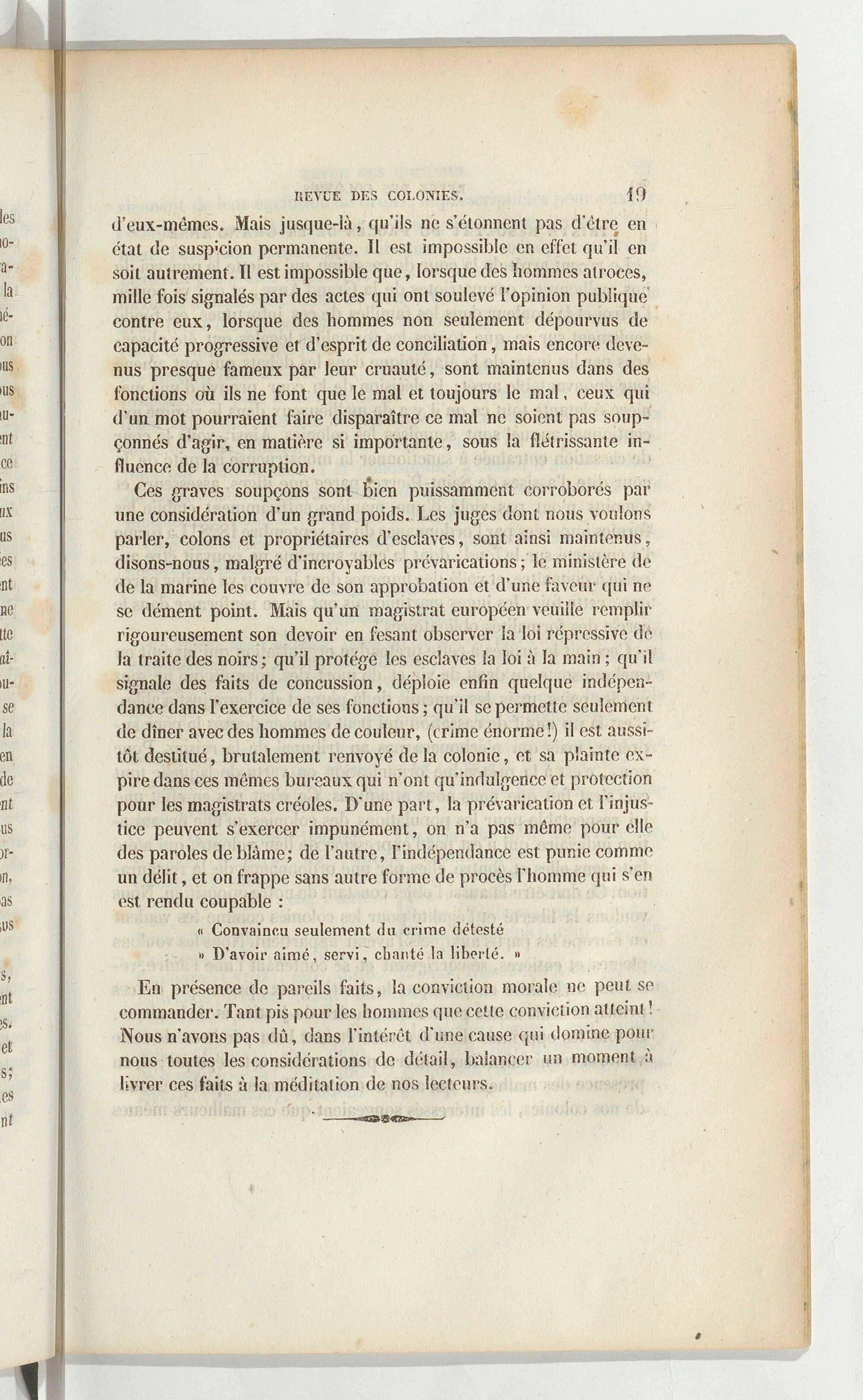 These grave suspicions are most powerfully corroborated by a consideration of great weight. The judges of whom we wish to speak—colonists and slave owners—are thus maintained, we say, despite incredible acts of malfeasance; the Ministry of the Navy covers them with its approval and with a favor that does not falter. But let a European magistrate wish to fulfill his duty rigorously by enforcing the repressive law against the slave trade; let him protect slaves with the law in hand; let him point out acts of peculation, finally display some independence in the exercise of his functions; let him permit himself only to dine with men of color (an enormous crime!)—he is immediately dismissed, brutally sent back from the colony, and his complaint expires in those same offices which have only indulgence and protection for Creole magistrates. On the one hand, malfeasance and injustice may be exercised with impunity; one does not even have words of blame for it. On the other, independence is punished like an offense, and without further form of trial one strikes the man who has been guilty of it: