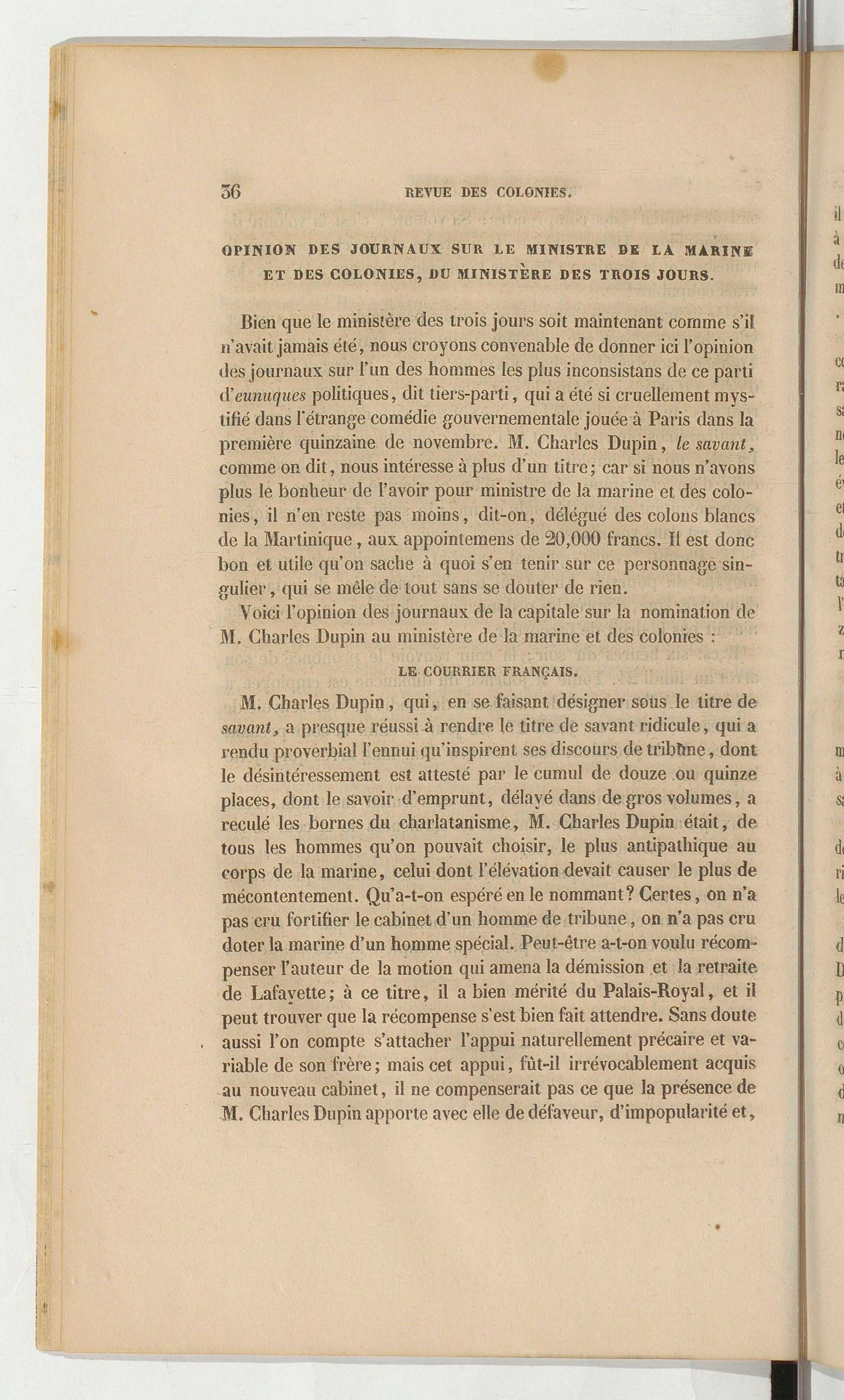 OPINION OF THE NEWSPAPERS ON THE MINISTER OF THE NAVY AND THE COLONIES, OF THE “THREE-DAY MINISTRY.”Although the “three-day ministry” is now as if it had never been, we believe it appropriate to give here the opinion of the newspapers on one of the most inconsistent men of that party of political eunuchs, called the third party, which was so cruelly mystified in the strange governmental comedy played in Paris in the first fortnight of November. M. Charles Dupin, the savant, as they say, interests us for more than one reason; for if we no longer have the happiness of having him as Minister of the Navy and the Colonies, he is nonetheless said to remain delegate of the white colonists of Martinique, with emoluments of 20,000 francs.OPINION OF THE NEWSPAPERS ON THE MINISTER OF THE NAVY AND THE COLONIES, OF THE “THREE-DAY MINISTRY.”Although the “three-day ministry” is now as if it had never been, we believe it appropriate to give here the opinion of the newspapers on one of the most inconsistent men of that party of political eunuchs, called the third party, which was so cruelly mystified in the strange governmental comedy played in Paris in the first fortnight of November. M. Charles Dupin, the savant, as they say, interests us for more than one reason; for if we no longer have the happiness of having him as Minister of the Navy and the Colonies, he is nonetheless said to remain delegate of the white colonists of Martinique, with emoluments of 20,000 francs. It is therefore good and useful to know what to think of this singular personage, who meddles in everything without suspecting anything.Here is the opinion of the capital’s newspapers on the appointment of M. Charles Dupin to the Ministry of the Navy and the Colonies:LE COURRIER FRANÇAIS.Mr. Charles Dupin, who, by having himself designated under the title of savant, has almost succeeded in making the title of savant ridiculous, who has made proverbial the boredom inspired by his tribune speeches, whose disinterestedness is attested by the accumulation of twelve or fifteen posts, whose borrowed learning, diluted in large volumes, has pushed back the limits of charlatanism, M. Charles Dupin was, of all the men who could be chosen, the most antipathic to the naval corps, the one whose elevation was bound to cause the most discontent. What was hoped for in appointing him? Certainly, it was not thought to strengthen the cabinet with a man of the tribune; it was not thought to endow the navy with a specialist. Perhaps it was wished to reward the author of the motion that brought about the resignation and retirement of Lafayette; in that respect, he has well merited the Palais-Royal, and he may find that the reward was long in coming. No doubt too, one counts on attaching the naturally precarious and variable support of his brother; but even if that support were irrevocably acquired to the new cabinet, it would not compensate for what the presence of M. Charles Dupin brings with it: disfavor, unpopularity,