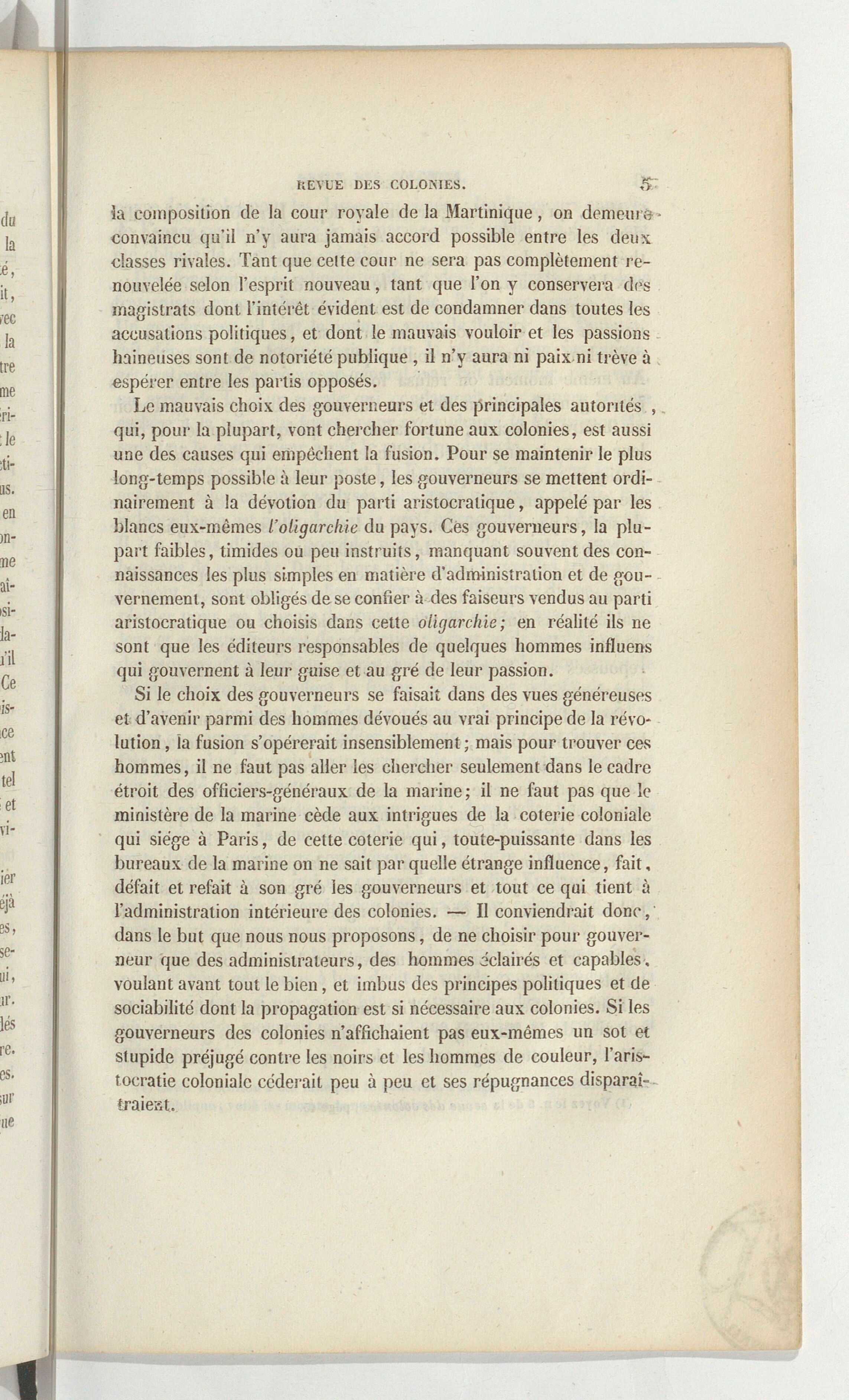 The poor selection of governors and of the principal authorities, who for the most part go to seek their fortune in the colonies, is also one of the causes that prevent the fusion. In order to remain in their post for as long as possible, the governors ordinarily place themselves at the service of the aristocratic party—called by the whites themselves the oligarchy of the country. These governors, most of them weak, timid, or little educated, often lacking the simplest knowledge in matters of administration and government, are obliged to entrust themselves to schemers sold to the aristocratic party or chosen within this oligarchy; in reality they are only the responsible publishers of a few influential men who govern as they please and at the whim of their passions.If the choice of governors were made with generous and forward-looking aims, among men devoted to the true principle of the revolution, the fusion would take place little by little; but to find these men, one must not look for them only within the narrow cadre of the navy’s general officers; the Ministry of the Navy must not yield to the intrigues of the colonial coterie that sits in Paris, that coterie which, all-powerful in the Navy offices—one knows not by what strange influence—makes, unmakes, and remakes at will the governors and everything that pertains to the internal administration of the colonies. It would therefore be fitting, for the purpose we propose, to choose as governor only administrators—enlightened and capable men—seeking above all the common good, and imbued with political principles and sociability whose propagation is so necessary in the colonies. If the governors of the colonies did not themselves display a foolish and stupid prejudice against Blacks and men of color, the colonial aristocracy would yield little by little and its repugnances would disappear.