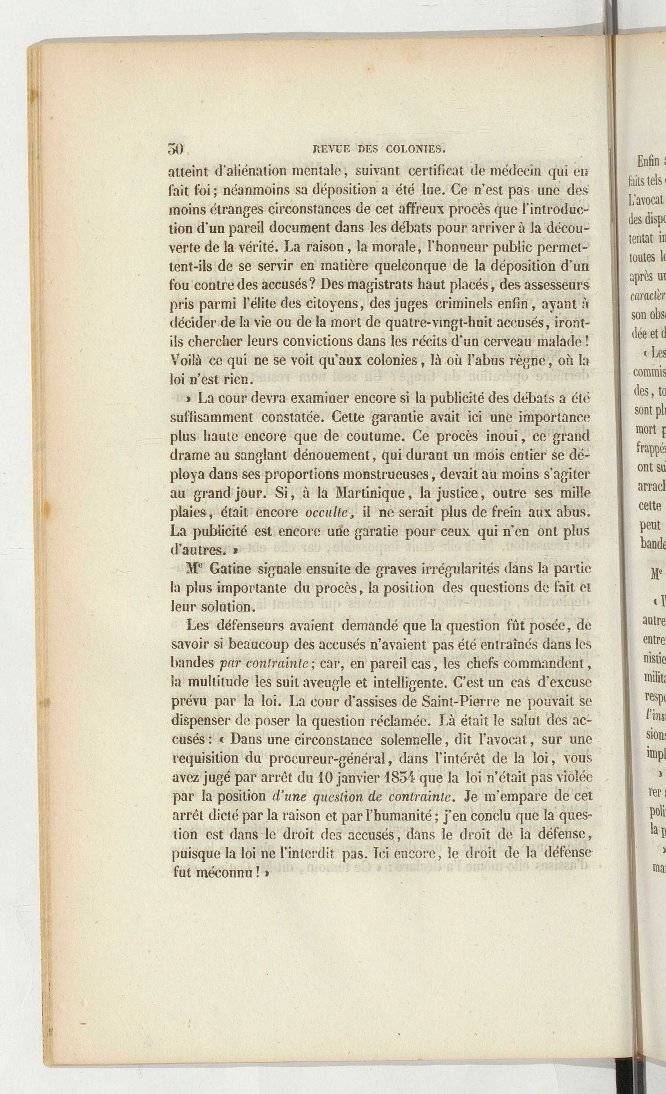 “was afflicted with mental alienation, according to a physician’s certificate that is probative; nevertheless his deposition was read. It is not one of the least strange circumstances of this dreadful trial that the introduction of such a document into the proceedings should be used to arrive at the discovery of truth. Do reason, morality, and public honor allow one to make use, in any matter whatsoever, of the deposition of a madman against accused persons? High-ranking magistrates, assessors taken from among the elite of citizens, criminal judges in short, having to decide the life or death of eighty-eight accused, will they seek their convictions in the narratives of a diseased mind! That is what is seen only in the colonies, there where abuse reigns, where the law is nothing.”” “The court must also examine whether the publicity of the hearings was sufficiently established. This guarantee had here an importance higher still than usual. This unheard-of trial, this great drama with its bloody denouement, which for an entire month unfolded in its monstrous proportions, ought at least to have taken place in the full light of day. If, in Martinique, justice, besides its thousand wounds, were also occult, there would no longer be any restraint on abuses. Publicity is still a guarantee for those who no longer have any other.”” Mr Gatine then points out grave irregularities in the most important part of the trial, the framing of the questions of fact and their resolution.The defenders had asked that the question be put whether many of the accused had not been dragged into the bands under constraint; for, in such a case, the leaders command, the multitude follows them, blind and intelligent. It is a case of excuse provided by law. The assize court of Saint-Pierre could not dispense with putting the requested question. There lay the salvation of the accused: ““In a solemn circumstance,” says counsel, “on an application by the Prosecutor General, in the interest of the law, you judged by decision of 10 January 1834 that the law was not violated by the putting of a question of constraint. I seize upon that decision dictated by reason and by humanity; I conclude from it that the question lies within the rights of the accused, within the rights of the defense, since the law does not forbid it. Here again, the right of the defense was ignored!””