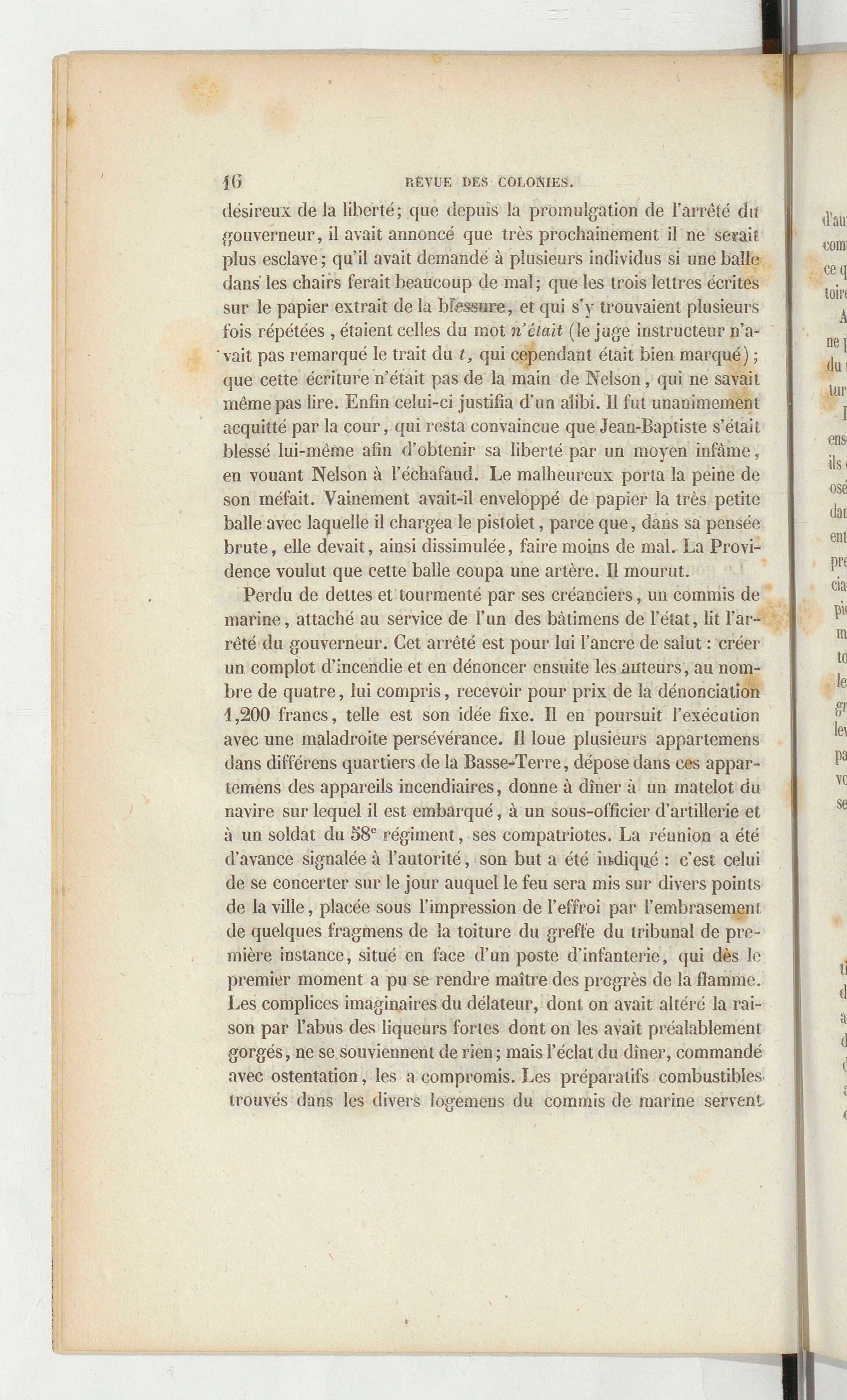 longed for freedom; that since the promulgation of the governor’s order he had announced that very soon he would no longer be a slave; that he had asked several individuals whether a bullet in the flesh would cause much pain; that the three letters written on the paper extracted from the wound, and which appeared there several times repeated, were those of the word n'était (the ignorant instructor had not noticed the stroke of the t, which, however, was clearly marked); that this handwriting was not by Nelson’s hand, Nelson who did not even know how to read. Finally, the latter established an alibi. He was unanimously acquitted by the court, which remained convinced that Jean-Baptiste had wounded himself in order to obtain his freedom by an infamous means, by devoting Nelson to the scaffold. The wretch paid the penalty of his misdeed. In vain had he wrapped in paper the very small bullet with which he loaded the pistol, because, in his coarse thinking, it was to cause less harm thus concealed. Providence willed that this bullet cut an artery. He died.Ruined by debts and tormented by his creditors, a naval clerk, attached to the service of one of the state vessels, read the governor’s order. This order became for him an anchor of salvation: to create an incendiary conspiracy and then denounce its authors—four in number, himself included—receive, as the price of denunciation, 1,200 francs: such is his fixed idea. He pursues its execution with an awkward perseverance. He rents several apartments in different quarters of Basse-Terre, deposits incendiary devices in these apartments, gives a dinner to a sailor from the ship on which he is embarked, to a non-commissioned artillery officer, and to a soldier of the 58th regiment, his compatriots. The meeting had been signaled in advance to the authorities; its aim had been indicated: to confer on the day on which fire would be set at various points of the city, already placed under the impression of terror by the burning of a few fragments of the roof of the clerk’s office of the court of first instance, situated opposite an infantry post, which from the first moment was able to master the progress of the flame. The imaginary accomplices of the informer—whose minds had been altered by the abuse of strong liquors with which they had been previously stuffed—remember nothing; but the splendor of the dinner, ordered with ostentation, compromised them. The combustible preparations found in the various lodgings of the naval clerk serve