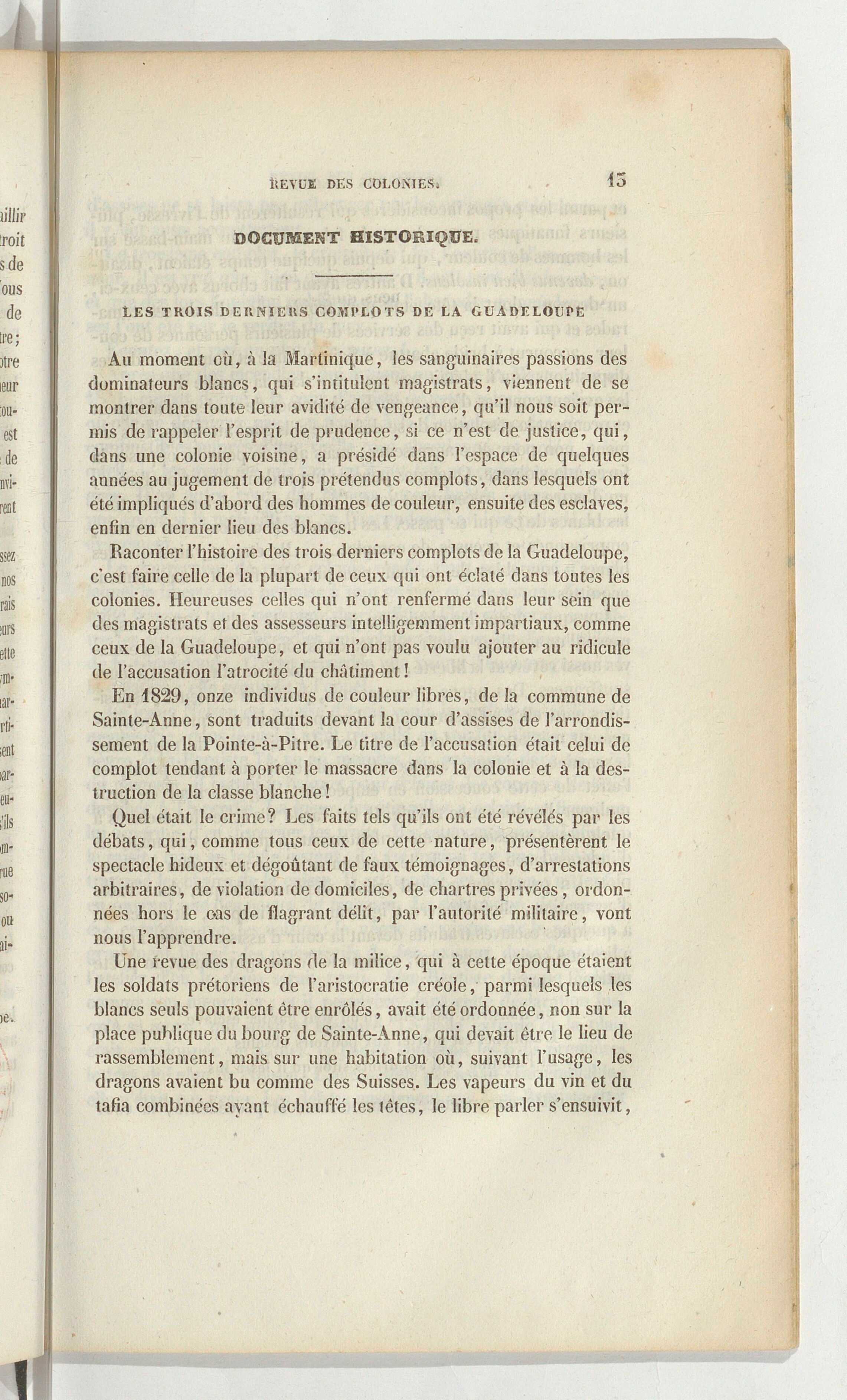 HISTORICAL DOCUMENT.THE LAST THREE CONSPIRACIES IN GUADELOUPEAt the very moment when, in MartiniqueMartinique, the bloodthirsty passions of the white rulers—who style themselves magistrates—have just shown themselves in all their avidity for vengeance, allow us to recall the spirit of prudence, if not of justice, which, in a neighboring colony, has, within the space of a few years, presided over the judgment of three alleged conspiracies, in which were implicated first men of color, then slaves, and finally, most recently, whites.To recount the history of the last three conspiracies in GuadeloupeGuadeloupe is to recount that of most of those that have erupted in all the colonies. Fortunate are those which have contained within their bosom only magistrates and assessors intelligently impartial, like those of GuadeloupeGuadeloupe, and which did not wish to add to the ridiculousness of the accusation the atrocity of the punishment!In 1829, eleven free individuals of color, from the commune of Sainte-Anne, were brought before the assize court of the district of Pointe-à-Pitre. The charge bore the title of a conspiracy tending to bring massacre into the colony and to the destruction of the white class!What was the crime? The facts, as they were revealed by the debates—which, like all those of this kind, presented the hideous and disgusting spectacle of false testimony, arbitrary arrests, violations of domiciles, of private papers, ordered outside the case of flagrante delicto by the military authority—will teach us.A review of the militia dragoons, who at that time were the praetorian soldiers of the Creole aristocracy, among whom whites alone could be enrolled, had been ordered—not on the public square of the borough of Sainte-Anne, which was to be the place of assembly, but on an estate where, as was customary, the dragoons had drunk like Swiss. The fumes of wine and tafia, combined, having heated their heads, free speech followed,