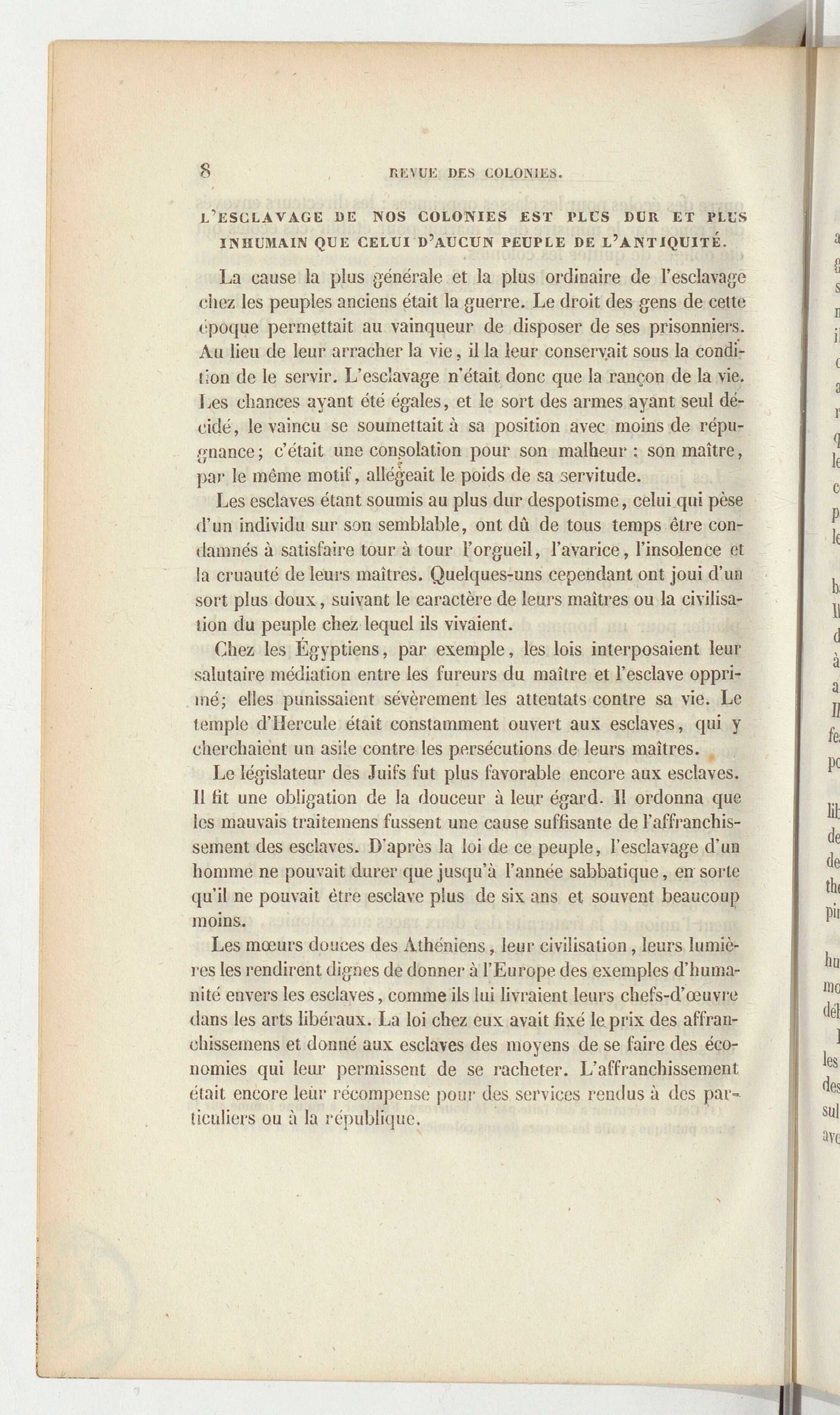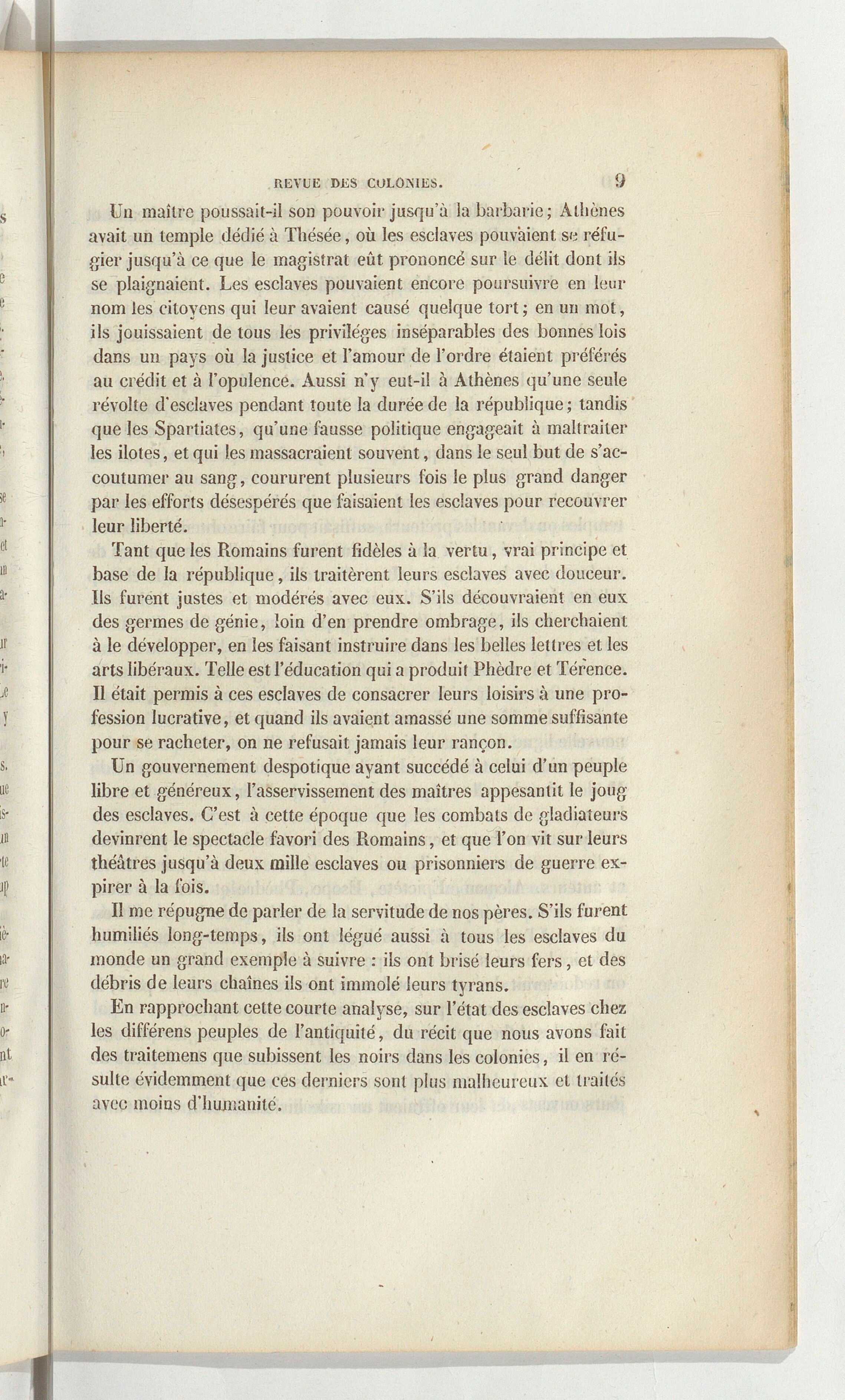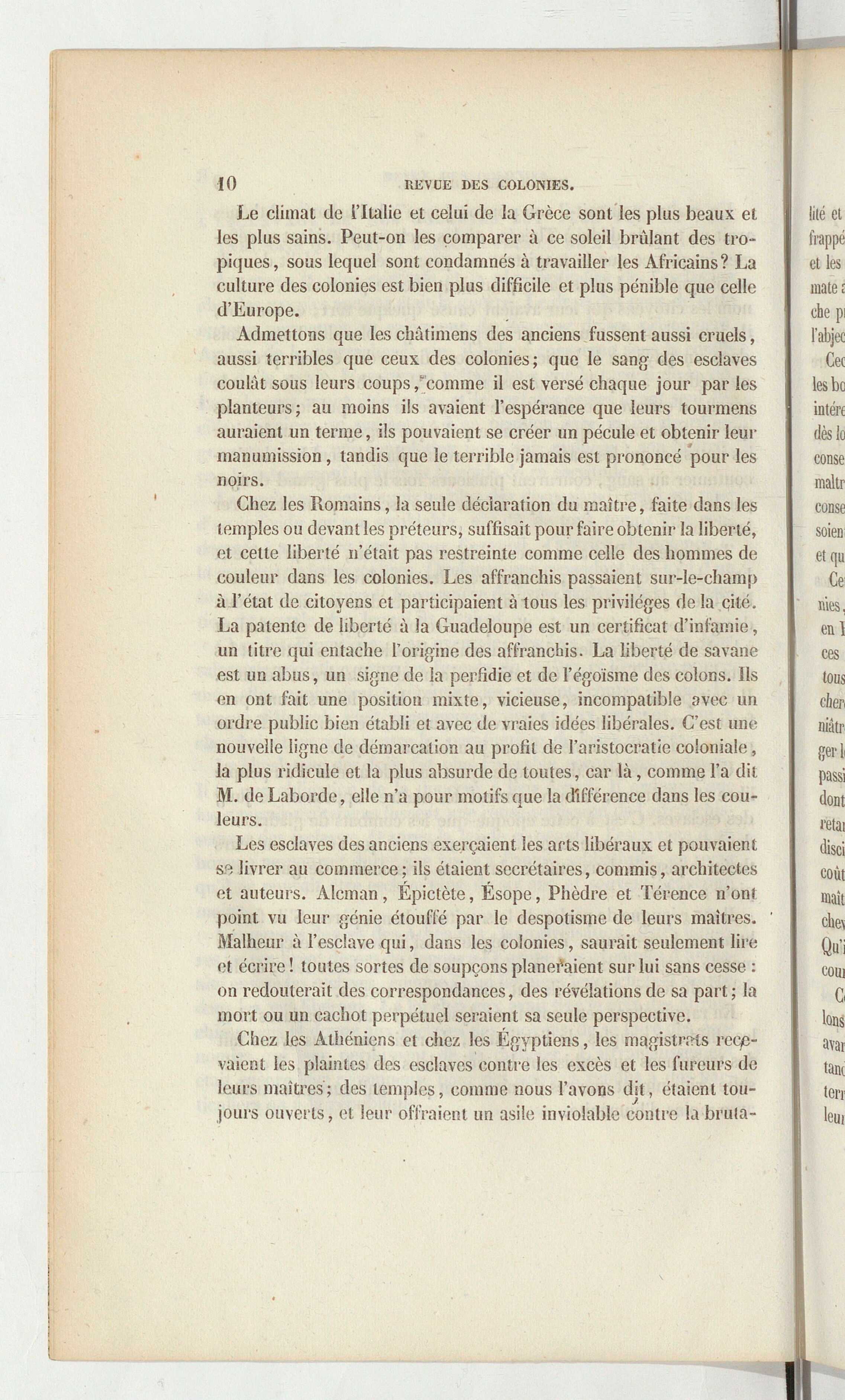 The climate of Italy and that of Greece are the finest and the healthiest. Can they be compared to that burning tropical sun under which Africans are condemned to labor? Cultivation in the colonies is far more difficult and more painful than in Europe.Let us grant that the punishments of the ancients were as cruel, as terrible as those of the colonies; that the blood of slaves flowed under their blows, as it is spilled every day by planters; at least they had the hope that their torments would have an end: they could create a small fund and obtain their manumission, whereas the dreadful “never” is pronounced for Blacks.Among the Romans, the master’s simple declaration, made in temples or before the praetors, was sufficient to obtain freedom, and that freedom was not restricted like that of men of color in the colonies. Freedmen passed at once into the condition of citizens and shared in all the privileges of the city. The patent of freedom in GuadeloupeGuadeloupe is a certificate of infamy, a title that stains the origin of the freed: “savanna freedom” is an abuse, a sign of the perfidy and egoism of the colonists. They have made of it a mixed, vicious condition, incompatible with a well-established public order and with true liberal ideas. It is a new line of demarcation in favor of the colonial aristocracy—the most ridiculous and the most absurd of all—for there, as M. de LabordeM. de Laborde has said, it has no motive other than difference of color.The slaves of antiquity practiced the liberal arts and could engage in commerce; they were secretaries, clerks, architects, and authors. Aleman, Epictetus, Aesop, Phaedrus, and Terence did not see their genius stifled by the despotism of their masters. Woe to the slave who, in the colonies, could so much as read and write! Every kind of suspicion would hover over him without cease: one would fear correspondence, revelations on his part; death or a perpetual dungeon would be his only prospect.Among the Athenians and among the Egyptians, magistrates received slaves’ complaints against the excesses and furies of their masters; temples, as we have said, were always open and offered them an inviolable asylum against brutality