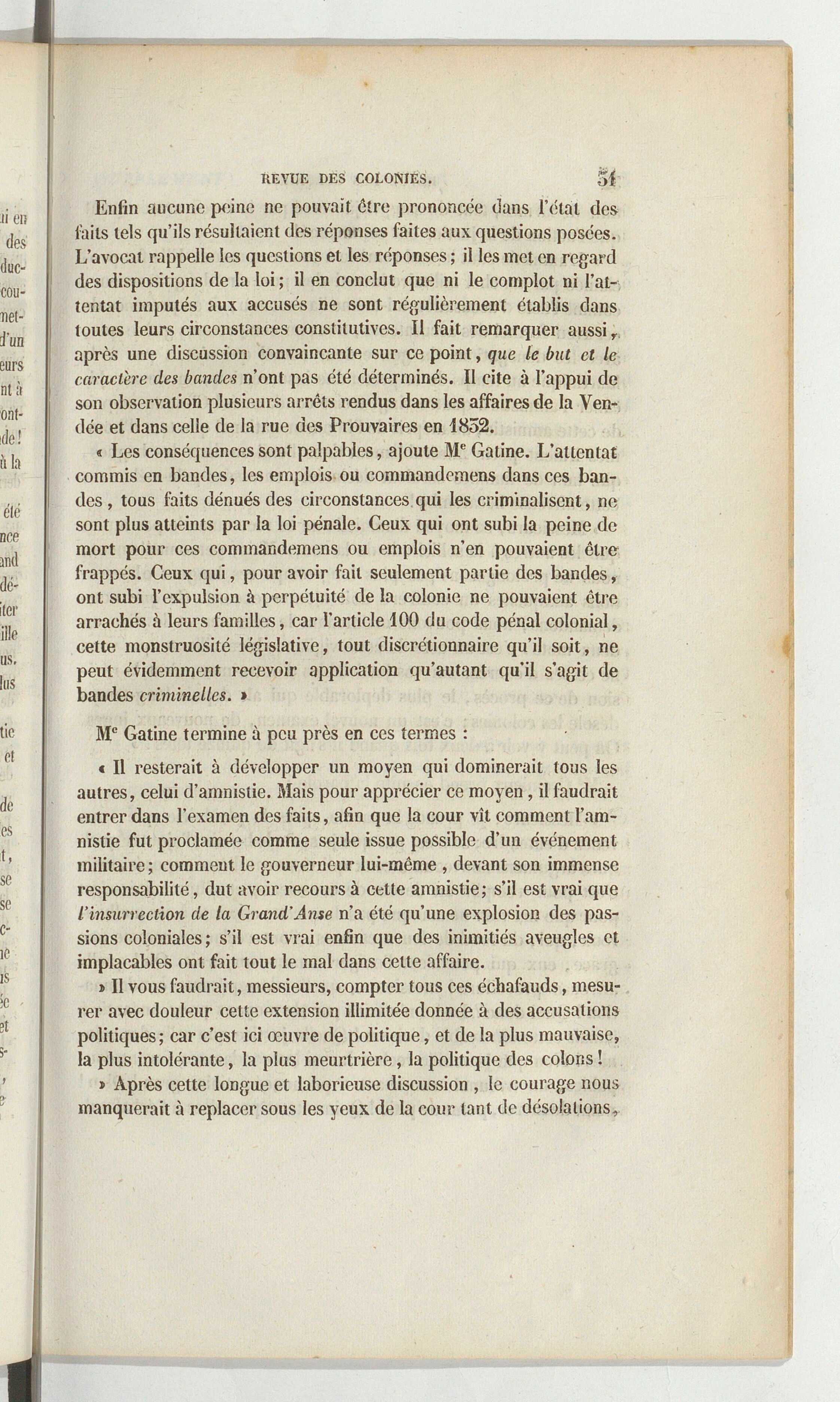 Finally, no penalty could be pronounced on the state of facts as they resulted from the answers given to the questions put. Counsel recalls the questions and the answers; he sets them alongside the provisions of the law; he concludes from them that neither the plot nor the attack imputed to the accused is duly established in all its constituent circumstances. He also notes, after a convincing discussion on this point, that the aim and the character of the bands were not determined. In support of his observation he cites several judgments rendered in the affairs of Vendée and in that of rue des Prouvaires in 1832. ““The consequences are palpable,” adds Me Gatine. “The attack committed in bands, the posts or commands in those bands, all facts stripped of the circumstances that criminalize them, are no longer reached by the penal law. Those who underwent the death penalty for those commands or posts could not be struck by it. Those who, for having merely been part of the bands, underwent perpetual expulsion from the colony could not be torn from their families, for article 100 of the colonial penal code, that legislative monstrosity, however discretionary it may be, can evidently be applied only insofar as it concerns criminal bands.”” Mr Gatine concludes in roughly these terms:““There would remain to develop one ground that would dominate all the others, that of amnesty. But to assess that ground, one would have to enter into the examination of the facts, so that the court might see how amnesty was proclaimed as the only possible issue to a military event; how the governor himself, before his immense responsibility, had to have recourse to that amnesty; whether it is true that the insurrection of Grand' Anse was only an explosion of colonial passions; whether it is true, finally, that blind and implacable enmities did all the evil in this affair.You would have to, gentlemen, count all these scaffolds, measure with sorrow this unlimited extension given to political accusations; for this is a work of politics, and of the worst, the most intolerant, the most murderous, the politics of the colonists!After this long and laborious discussion, courage would fail us to place again before the eyes of the court so many desolations,