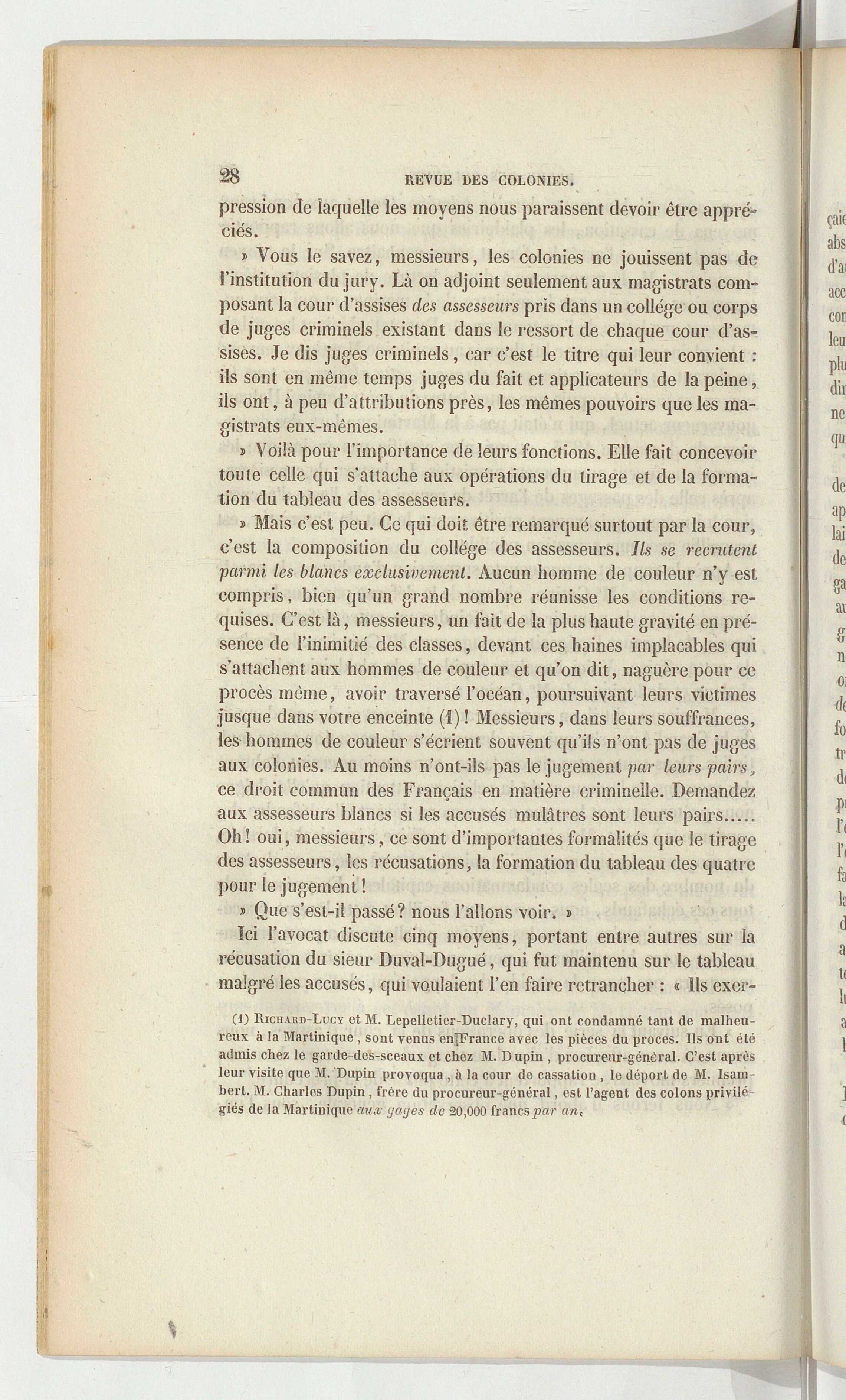 pression of which the grounds seem to us to require assessment.”” ““You know it, gentlemen, the colonies do not enjoy the institution of the jury. There one merely adds to the magistrates composing the assize court assessors taken from a college or body of criminal judges existing within the jurisdiction of each assize court. I say criminal judges, for that is the title that suits them: they are at once judges of fact and appliers of the penalty; they have, with few differences of attribution, the same powers as the magistrates themselves.”” ““That is the importance of their functions. It makes one grasp the equal importance attached to the operations of the drawing and the formation of the assessors’ list.”” ““But that is not all. What the court must remark above all is the composition of the assessors’ college. They are recruited exclusively among whites. No man of color is included, although a great number meet the required conditions. That is, gentlemen, a fact of the highest gravity in the presence of class enmity, before these implacable hatreds that attach to men of color and which, it was said, recently for this very trial, crossed the ocean, pursuing their victims even into your hall (1)! Gentlemen, in their sufferings, men of color often cry out that they have no judges in the colonies. At the very least they do not have judgment by their peers, that common right of French citizens in criminal matters. Ask the white assessors whether the mulatto accused are their peers…. Oh! yes, gentlemen, the drawing of the assessors, the recusals, the formation of the list of four for judgment, these are important formalities!”” ““What happened? We shall see.”” Here counsel discusses five grounds, relating among other things to the recusal of the sieur Duval-Dugué, who was kept on the list despite the accused, who wished to have him struck out: “They were exer(1) RICHARD-Lucy and M. Lepelletier-Duclary, who have condemned so many unfortunates in Martinique, came to France with the documents of the trial. They were received by the Keeper of the Seals and by M. Dupin, Prosecutor General. After their visit, M. Dupin sought, before the Court of Cassation, the removal of M. Isambert. M. Charles Dupin, brother of the Prosecutor General, is the agent of the privileged colonists of Martiniqueon a wage of 20,000 francs per year.