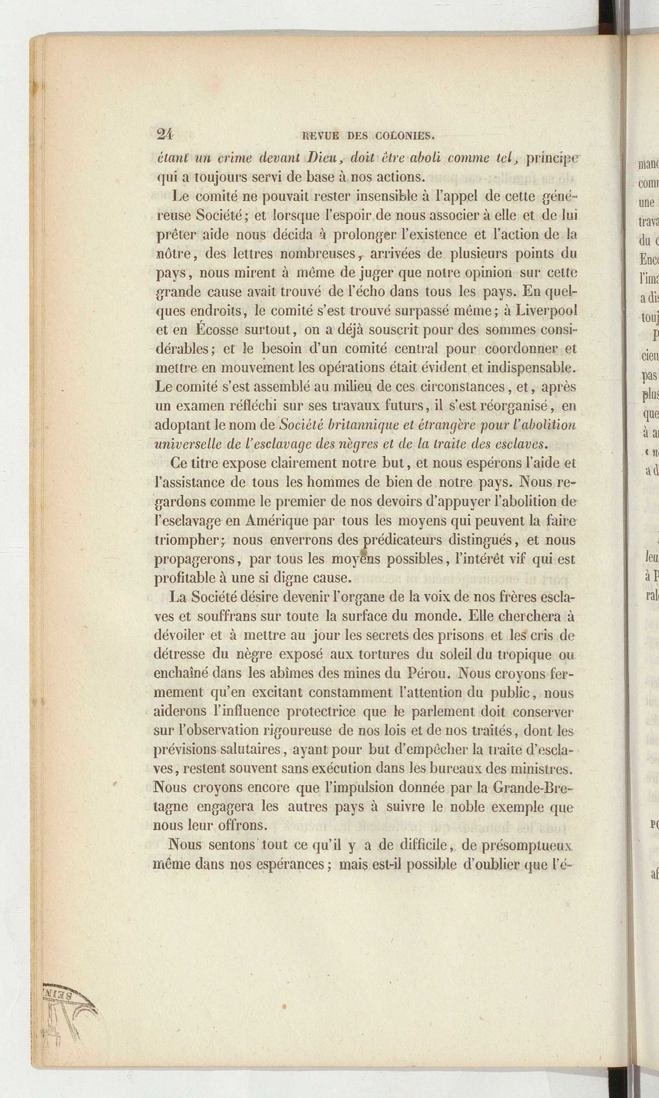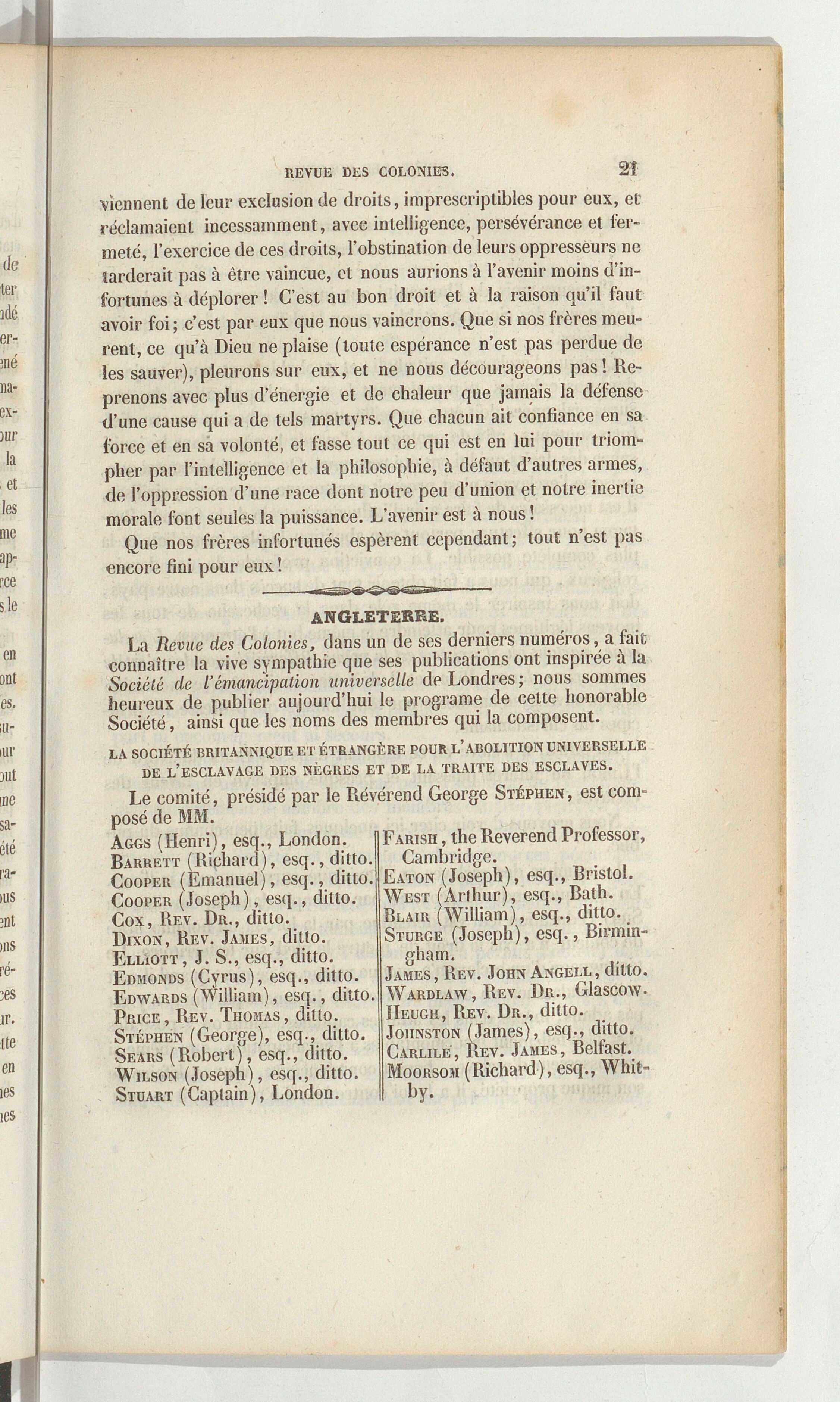 from rights (rights imprescriptible for them), and were to demand unceasingly, with intelligence, perseverance, and firmness, the exercise of those rights, the obstinacy of their oppressors would soon be overcome, and we would have fewer misfortunes to lament in the future! It is in just right and in reason that we must have faith; it is by them that we shall prevail. And if our brothers die (God forbid, for all hope is not lost of saving them), let us weep for them, and not lose heart! Let us take up again, with more energy and ardor than ever, the defense of a cause that has such martyrs. Let each have confidence in his strength and in his will, and do all that lies within him to triumph, through intelligence and philosophy, for want of other weapons, over the oppression of a race whose power is made solely by our lack of unity and our moral inertia. The future is ours!Let our unfortunate brothers hope nonetheless; all is not yet finished for them!ENGLAND.The Revue des Colonies, in one of its most recent issues, made known the keen sympathy that its publications have inspired in the Society for Universal Emancipation of London; we are pleased to publish today the program of this honorable Society, as well as the names of the members who compose it.THE BRITISH AND FOREIGN SOCIETY FOR THE UNIVERSAL ABOLITION OF NEGRO SLAVERY AND THE SLAVE TRADE.The committee, chaired by the Reverend George STEPHEN, is com