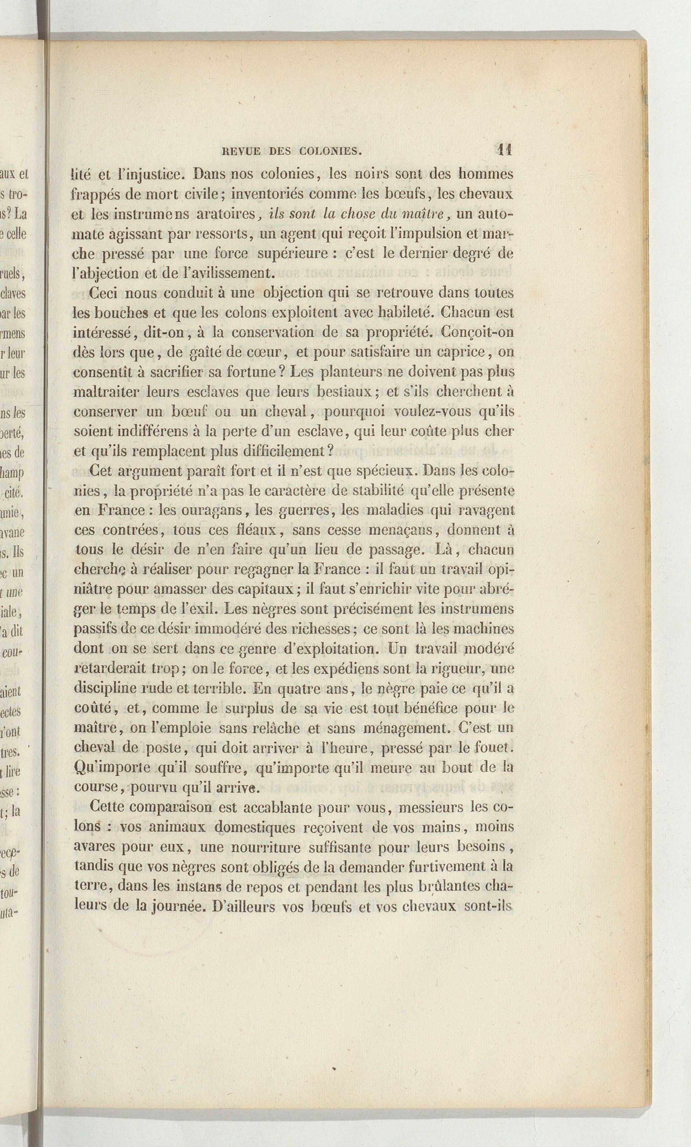 and injustice. In our colonies, Blacks are men struck with civil death, inventoried like oxen, horses, and ploughing implements; they are the master’s property, an automaton driven by springs, an agent that receives the impulse and moves, pressed by a superior force: it is the lowest degree of abjection and debasement.This leads us to an objection found on every tongue and which the colonists exploit with skill. Everyone has an interest, it is said, in preserving his property. Can one then conceive that, cheerfully, and to satisfy a whim, one would consent to sacrifice one’s fortune? Planters should not mistreat their slaves any more than their livestock; and if they seek to preserve an ox or a horse, why would you have them be indifferent to the loss of a slave, who costs them more and whom they replace with greater difficulty?This argument seems strong, and it is only specious. In the colonies, property does not have the stability it presents in France: hurricanes, wars, the diseases that ravage those lands—those scourges, constantly threatening—give everyone the desire to make of them only a place of passage. There, each seeks to liquidate in order to return to France: it takes stubborn labor to amass capital; one must grow rich quickly to shorten the time of exile. Negroes are precisely the passive instruments of this immoderate desire for riches; they are the machines used in this kind of exploitation. Moderate labor would delay too much; it is forced, and the expedients are rigor, a harsh and terrible discipline. In four years, the Negro pays what he cost, and since the remainder of his life is pure profit for the master, he is employed without respite and without consideration. He is a post-horse that must arrive on time, driven by the whip! What does it matter if he suffers, what does it matter if he dies at the end of the run, provided he arrives.This comparison is crushing for you, gentlemen planters: your domestic animals receive from your hands—less miserly for them—food sufficient for their needs, while your Negroes are obliged to ask it furtively of the earth, in the moments of rest and during the most scorching heat of the day. Besides, are your oxen and your horses