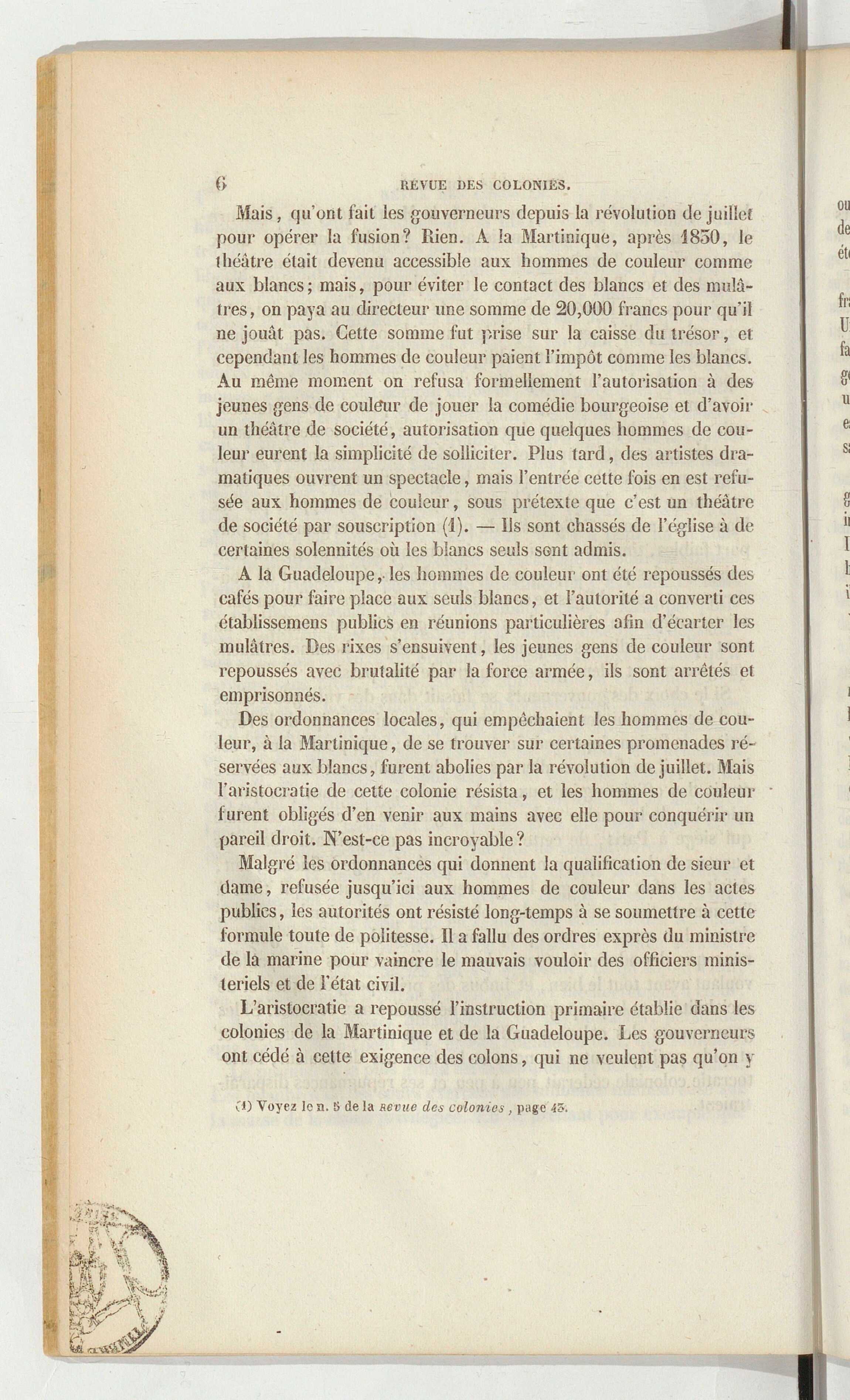 open schools for the oppressed classes: the directors sent from FranceFrance by the Minister of the Navy to establish these schools were obliged to leave the colonies.Administrative officials and European magistrates fraternize with men of color; they receive them at dinner. A governor (his name must be given, to brand him), M. DupotetM. Dupotet, has these officials deported on the complaint of a Creole prosecutor general. This prosecutor general had, shortly before, carried out a ruling of the royal court that sentenced a poor enslaved woman to the lash for having sung La Parisienne (1), without the governor placing the slightest obstacle in the way.Young Creole lawyers and Europeans who want progress in the colonies are paralyzed in their generous efforts; their independence is null before the retrograde party, called oligarchy. There is no possible future for them if they dare to show themselves men of progress. In their pleadings before the courts, they are constantly obliged to be circumspect, never to plead for a man of color or an enslaved person with that ardor and that momentum of conviction; they must plead only for mitigating circumstances, because the royal court—composed of magistrates who want fusion only with scaffolds and the executioner—calls to order or insolently reprimands the courageous lawyer who dares to plead with conscientious energy. From then on, no future for them—only tedium, persecutions, and disgusts of every kind.Such are the principal obstacles which, in those French colonies we know most particularly, delay this fusion, which we rightly consider one of the greatest advances that can be accomplished there. Sincerely desiring the union and fraternity of the two races in the colonies, however great our confidence may otherwise be in the near and universal triumph of philosophy and reason, it is painful to us—and we lament with good cause—to see the government of the metropolis do so little to hasten this triumph in lands where its action could be exercised in so direct and so decisive a manner.