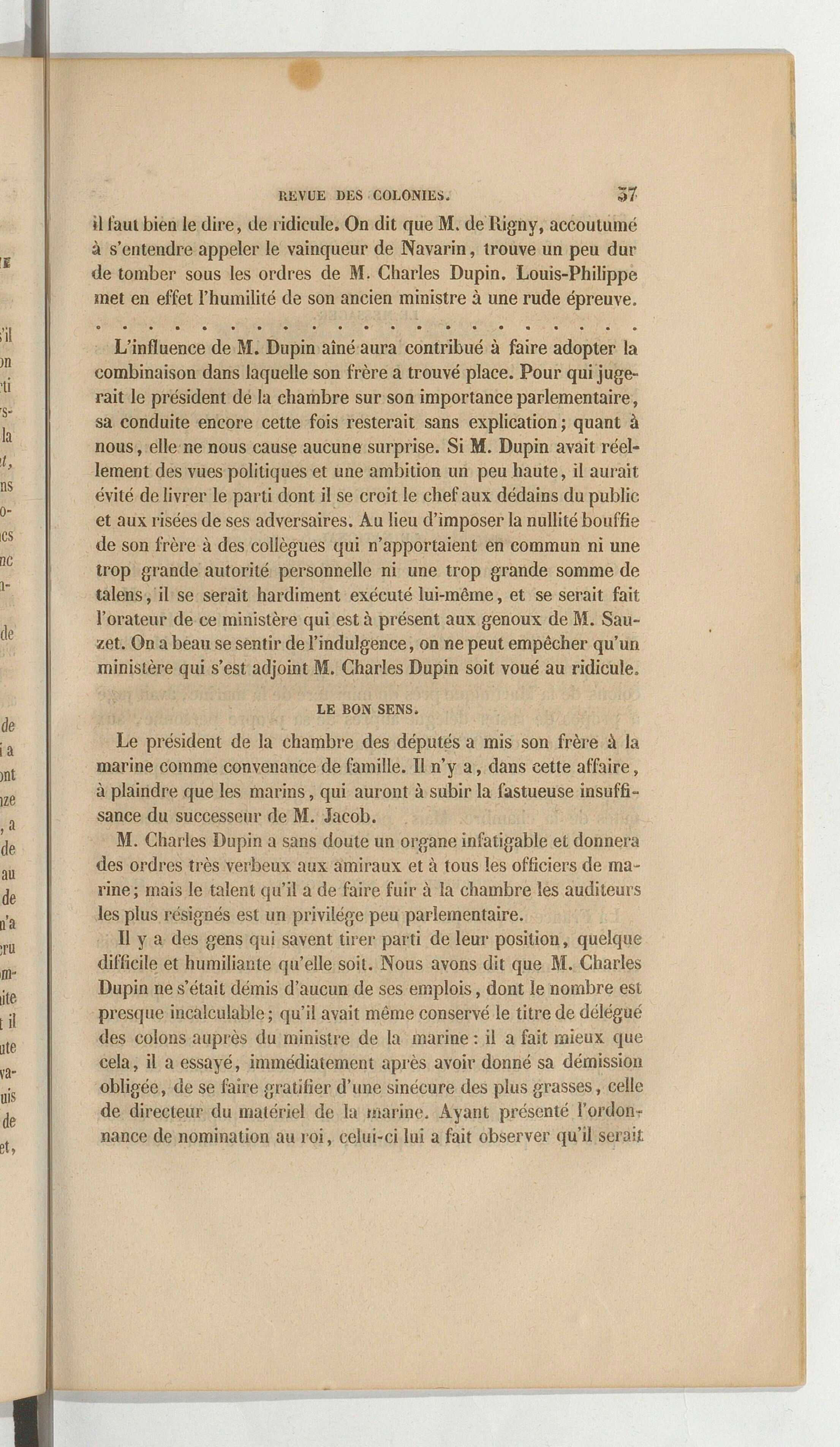 and, it must be said, ridicule. It is said that M. de Rigny, accustomed to being called the victor of Navarino, finds it somewhat hard to fall under the orders of M. Charles Dupin. Louis-Philippe indeed subjects the humility of his former minister to a rude test.The influence of M. Dupin the elder will have contributed to having the combination adopted in which his brother found a place. For anyone who would judge the President of the Chamber by his parliamentary importance, his conduct, once again, would remain without explanation; as for us, it causes us no surprise. If M. Dupin truly had political views and an ambition somewhat lofty, he would have avoided delivering the party of which he believes himself the leader to the public’s disdain and to the laughter of his adversaries. Instead of imposing the inflated nullity of his brother on colleagues who together brought neither too great a personal authority nor too great a sum of talents, he would have boldly undertaken it himself, and would have made himself the orator of that ministry which is now at the knees of M. Sauzet. One may feel indulgence toward oneself, but one cannot prevent a ministry that has added M. Charles Dupin to itself from being devoted to ridicule.LE BON SENS.The President of the Chamber of Deputies put his brother at the navy as a matter of family convenience. In this affair, there is no one to pity but the sailors, who will have to endure the pompous insufficiency of the successor of M. Jacob.M. Charles Dupin no doubt has a tireless organ and will give very verbose orders to admirals and to all naval officers; but the talent he has for making even the most resigned listeners flee the Chamber is a privilege that is not very parliamentary.There are people who know how to profit from their position, however difficult and humiliating it may be. We have said that M. Charles Dupin had resigned none of his employments, whose number is almost incalculable; that he had even kept the title of delegate of the colonists to the Minister of the Navy: he did better than that, he tried, immediately after giving his forced resignation, to have himself granted one of the richest sinecures, that of director of naval matériel. Having presented the ordinance of appointment to the king, the latter observed
