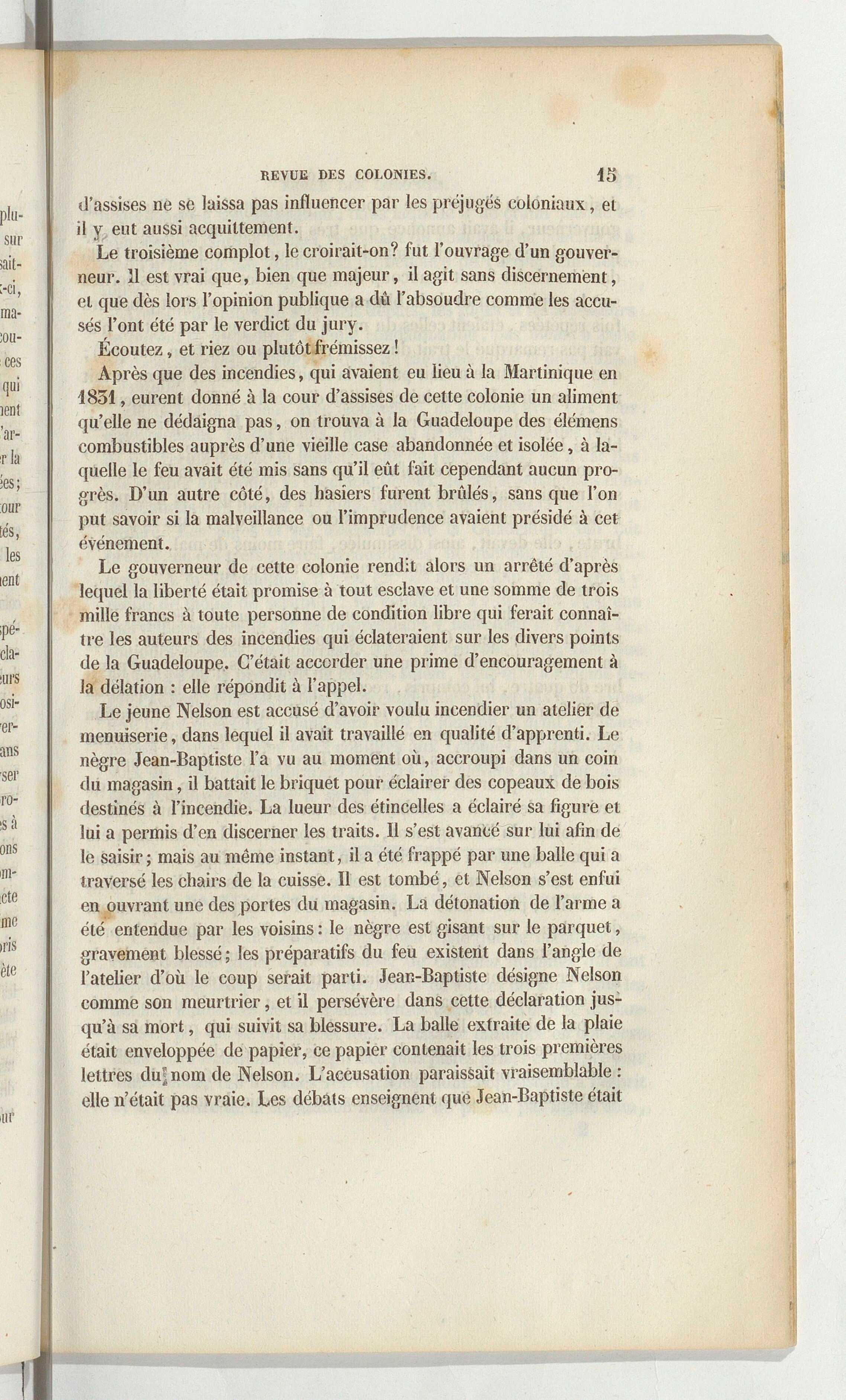 court did not allow itself to be influenced by colonial prejudices, and there was acquittal as well.The third conspiracy—would one believe it?—was the work of a governor. It is true that, although of age, he acted without discernment, and that from then on public opinion had to absolve him, just as the accused were absolved by the jury’s verdict.Listen—and laugh, or rather shudder!After fires that had taken place in MartiniqueMartinique in 1851 had provided the assize court of that colony with a matter it did not disdain, there were found in GuadeloupeGuadeloupe combustible materials near an old abandoned and isolated hut, to which fire had been set, though it had made no progress. On the other hand, hedges were burned, without it being possible to know whether malice or imprudence had presided over the event.The governor of that colony then issued an order according to which freedom was promised to any slave, and a sum of three thousand francs to any free person, who would make known the authors of fires that might break out at various points of GuadeloupeGuadeloupe. This was to offer a bounty to denunciation: it answered the call.Young Nelson is accused of having wished to set fire to a carpentry workshop in which he had worked as an apprentice. The Negro Jean-Baptiste saw him at the moment when, crouched in a corner of the shop, he was striking a flint to light wood shavings destined for the fire. The glow of the sparks lit up his face and allowed him to discern his features. He moved toward him in order to seize him; but at that very instant he was struck by a bullet that passed through the flesh of his thigh. He fell, and Nelson fled by opening one of the doors of the shop. The report of the weapon was heard by the neighbors: the Negro lay on the floorboards, gravely wounded; the preparations for the fire were found in the corner of the workshop from which the shot was said to have come. Jean-Baptiste named Nelson as his murderer, and he persisted in that declaration until his death, which followed his wound. The bullet extracted from the wound was wrapped in paper; that paper contained the first three letters of Nelson’s name. The accusation appeared plausible: it was not true. The debates show that Jean-Baptiste