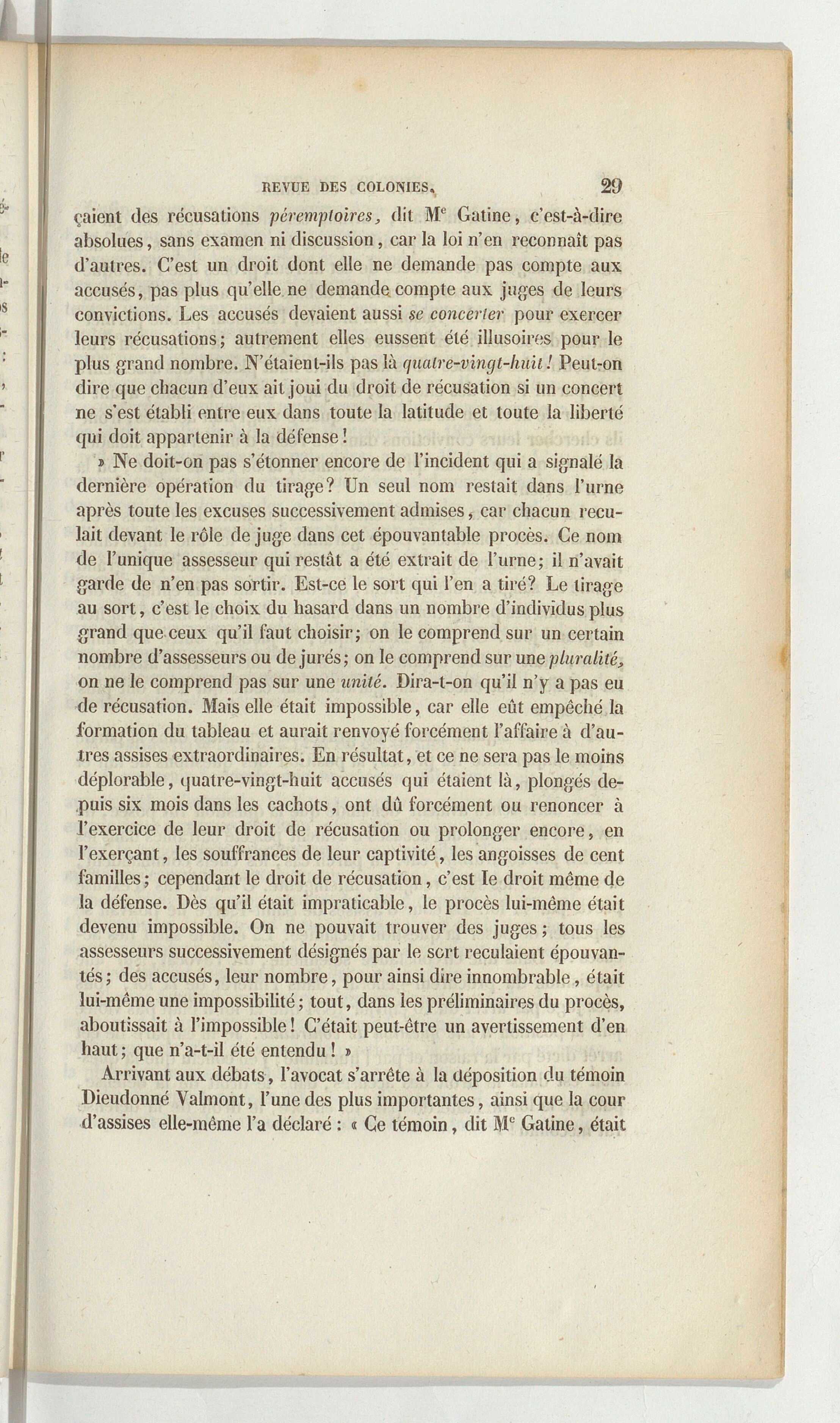 cising peremptory challenges, said Me Gatine, that is to say, absolute, without examination or discussion, for the law recognizes no others. It is a right for which it asks no account of the accused, no more than it asks account of judges for their convictions. The accused also had to confer in order to exercise their challenges; otherwise they would have been illusory for the greater number. Were they not there eighty-eight! Can one say that each of them enjoyed the right of challenge if no concert was established among them in all the breadth and all the freedom that must belong to the defense!” ““Should one not be astonished as well by the incident that marked the last operation of the drawing? A single name remained in the urn after all the excuses successively admitted, for everyone recoiled before the role of judge in this horrifying trial. The name of the sole assessor remaining was drawn from the urn; it could hardly fail to come out. Was it chance that drew it? Drawing lots is the choice of chance among a number of individuals greater than those that must be chosen; one understands it for a certain number of assessors or jurors; one understands it for a plurality; one does not understand it for a unity. Will it be said that there was no recusal? But it was impossible, for it would have prevented the formation of the list and would necessarily have sent the case to other extraordinary assizes. In sum, and this will not be the least deplorable, eighty-eight accused who were there, plunged for six months into dungeons, were forced either to renounce the exercise of their right of recusal or, by exercising it, to prolong still further the sufferings of their captivity, the anguish of a hundred families; yet the right of recusal is the very right of the defense. Once it was impracticable, the trial itself had become impossible. One could not find judges; all the assessors successively designated by lot recoiled in terror; the accused, by their number, so to speak innumerable, were themselves an impossibility; everything, in the preliminaries of the trial, led to the impossible! It was perhaps a warning from on high; if only it had been heard!”” Coming to the hearings, counsel pauses on the testimony of the witness Dieudonné Valmont, one of the most important, as the assize court itself declared: ““This witness,” says Mr Gatine,
