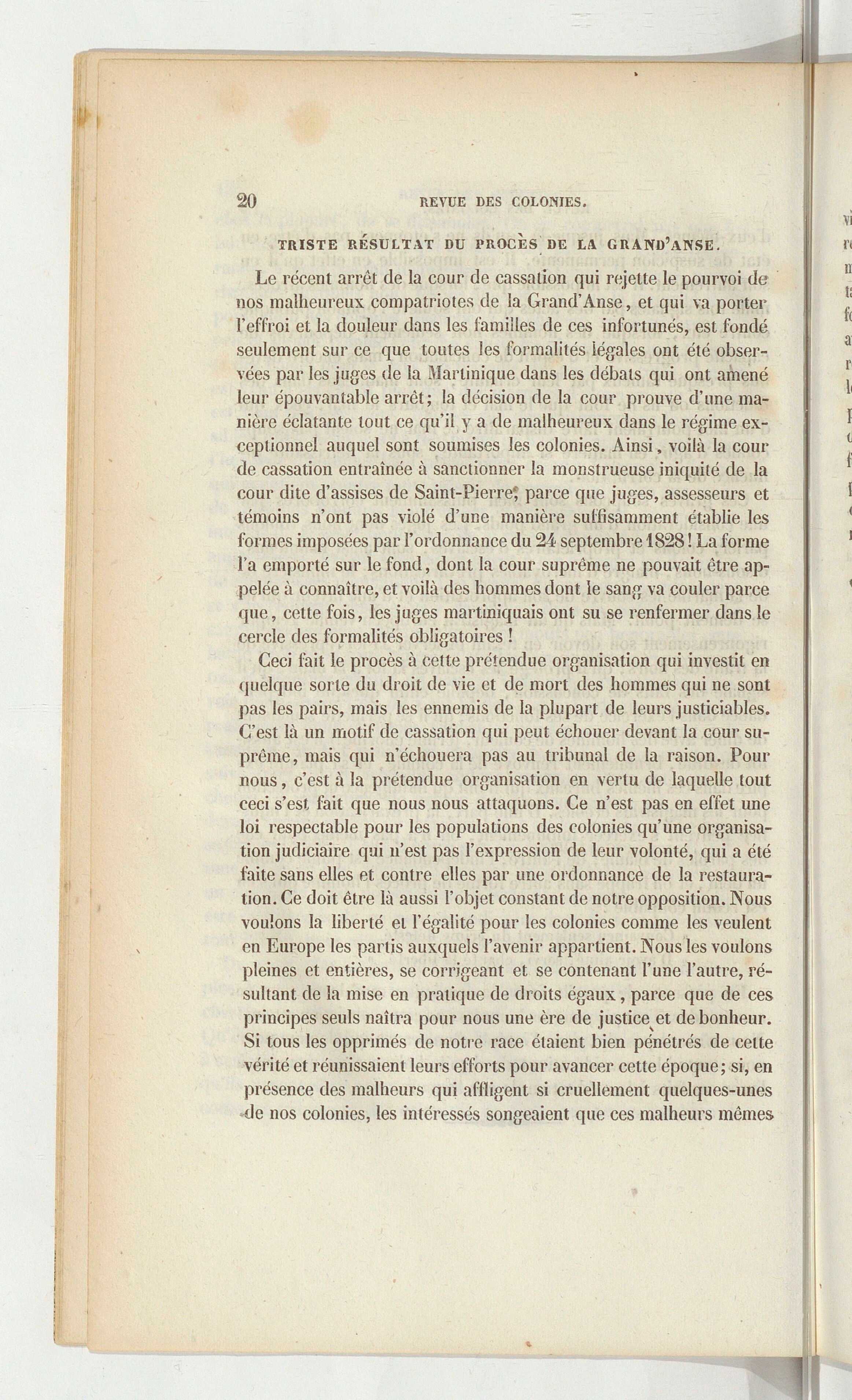 SAD OUTCOME OF THE TRIAL OF GRAND'ANSEGRAND'ANSE.The recent decision of the Court of Cassation rejecting the appeal of our unfortunate compatriots of Grand'AnseGrand'Anse, and which is about to bring terror and sorrow into the families of these wretched people, is founded solely on the fact that all legal formalities were observed by the judges of MartiniqueMartinique in the proceedings that led to their horrifying judgment. The Court’s decision strikingly demonstrates all that is tragic in the exceptional regime to which the colonies are subjected. Thus, we have the Court of Cassation driven to sanction the monstrous iniquity of the so-called assize court of Saint-PierreSaint-Pierre, because judges, assessors, and witnesses did not violate, in a sufficiently established manner, the forms imposed by the ordinance of 24 September 1828! Form has prevailed over substance, of which the supreme court could not be called upon to take cognizance, and thus men’s blood will flow because, this time, the Martiniquan judges knew how to confine themselves within the circle of obligatory formalities!This constitutes the indictment of that supposed organization which, in a sense, vests with the right of life and death men who are not the peers, but the enemies, of most of those they judge. That is a ground for cassation that may fail before the supreme court, but it will not fail before the tribunal of reason. For our part, it is the supposed organization by virtue of which all this has been done that we attack. For it is not, indeed, a law worthy of respect for the populations of the colonies, this judicial organization that is not the expression of their will, that was made without them and against them by an ordinance of the Restoration. That too must be the constant object of our opposition. We want freedom and equality for the colonies, as the parties to whom the future belongs want them in Europe. We want them full and entire, correcting and containing one another, resulting from the practical implementation of equal rights, because from these principles alone will be born for us an era of justice and happiness. If all the oppressed of our race were truly imbued with this truth and united their efforts to bring that time forward; if, in the face of the misfortunes that so cruelly afflict some of our colonies, those concerned would reflect that these very misfortunes arise from their exclusion