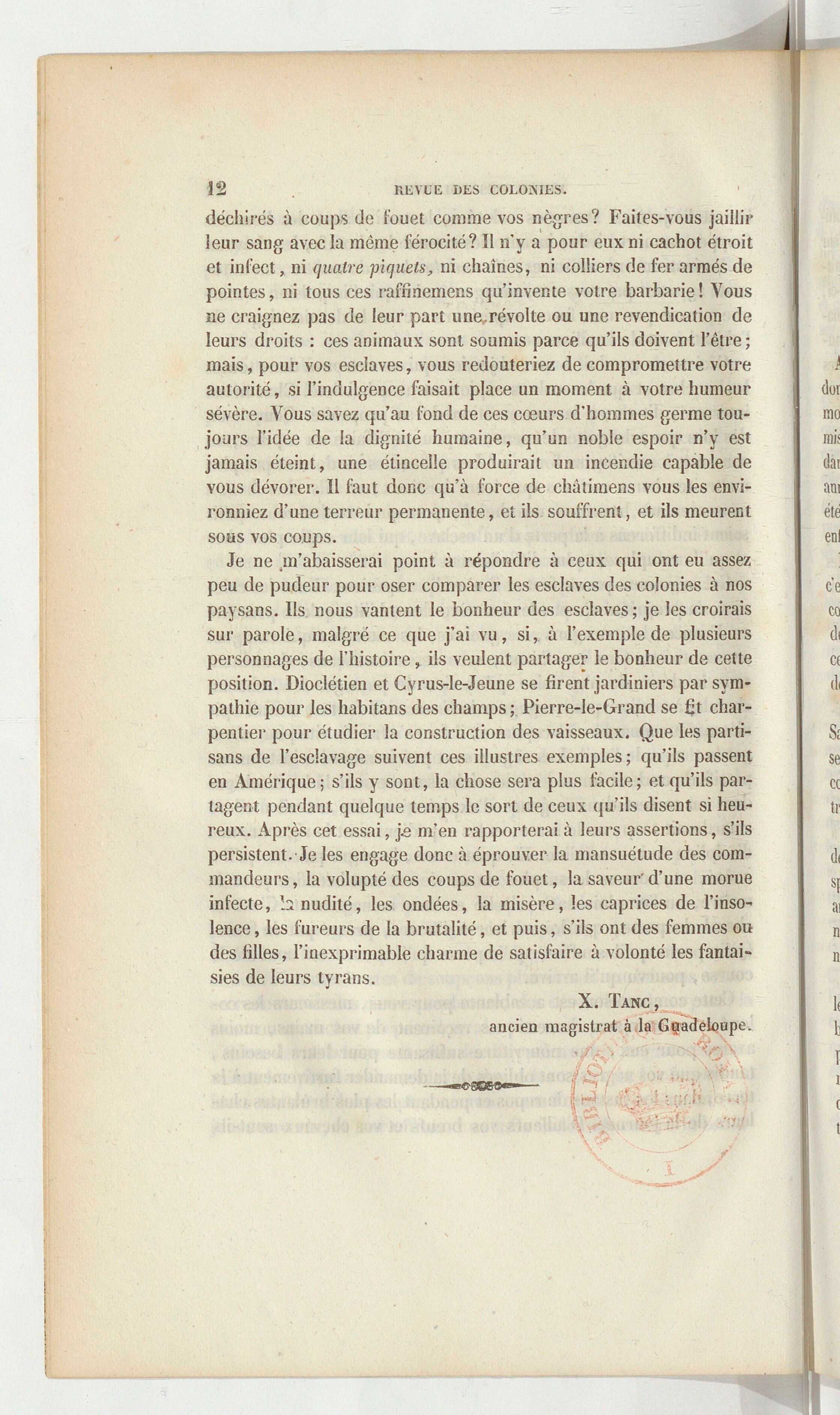 torn by whip blows like your Negroes? Do you make their blood spurt with the same ferocity? For them there is neither narrow, foul dungeon nor four stakes, nor chains, nor iron collars armed with spikes, nor all those refinements invented by your barbarity! You do not fear from them a revolt or a claim to rights: these animals are submissive because they must be; but for your slaves you would fear compromising your authority if indulgence were to take the place, for a moment, of your severe temper. You know that, in the depths of these human hearts, the idea of human dignity always germinates, that a noble hope is never extinguished there; a spark would produce a conflagration capable of consuming you. It is therefore necessary, by force of punishments, to surround them with a permanent terror, and they suffer, and they die under your blows.I will not demean myself by answering those who have had little enough modesty to dare to compare the slaves of the colonies to our peasants. They extol to us the happiness of slaves; I would take them at their word, despite what I have seen, if, following the example of several figures in history, they wish to share the happiness of that condition. Diocletian and Cyrus the Younger made themselves gardeners out of sympathy for the inhabitants of the countryside; Peter the Great made himself a carpenter to study shipbuilding. Let the partisans of slavery follow these illustrious examples; let them go to America—if they are there, the thing will be easier—and let them share for some time the lot of those they claim so happy. After this trial, I shall defer to their assertions, if they persist. I therefore urge them to experience the leniency of the overseers, the voluptuousness of whip blows, the taste of a foul cod, nakedness, downpours, misery, the caprices of insolence, the furies of brutality—and then, if they have wives or daughters, the inexpressible charm of being made to satisfy at will the fancies of their tyrants.X. TANC,