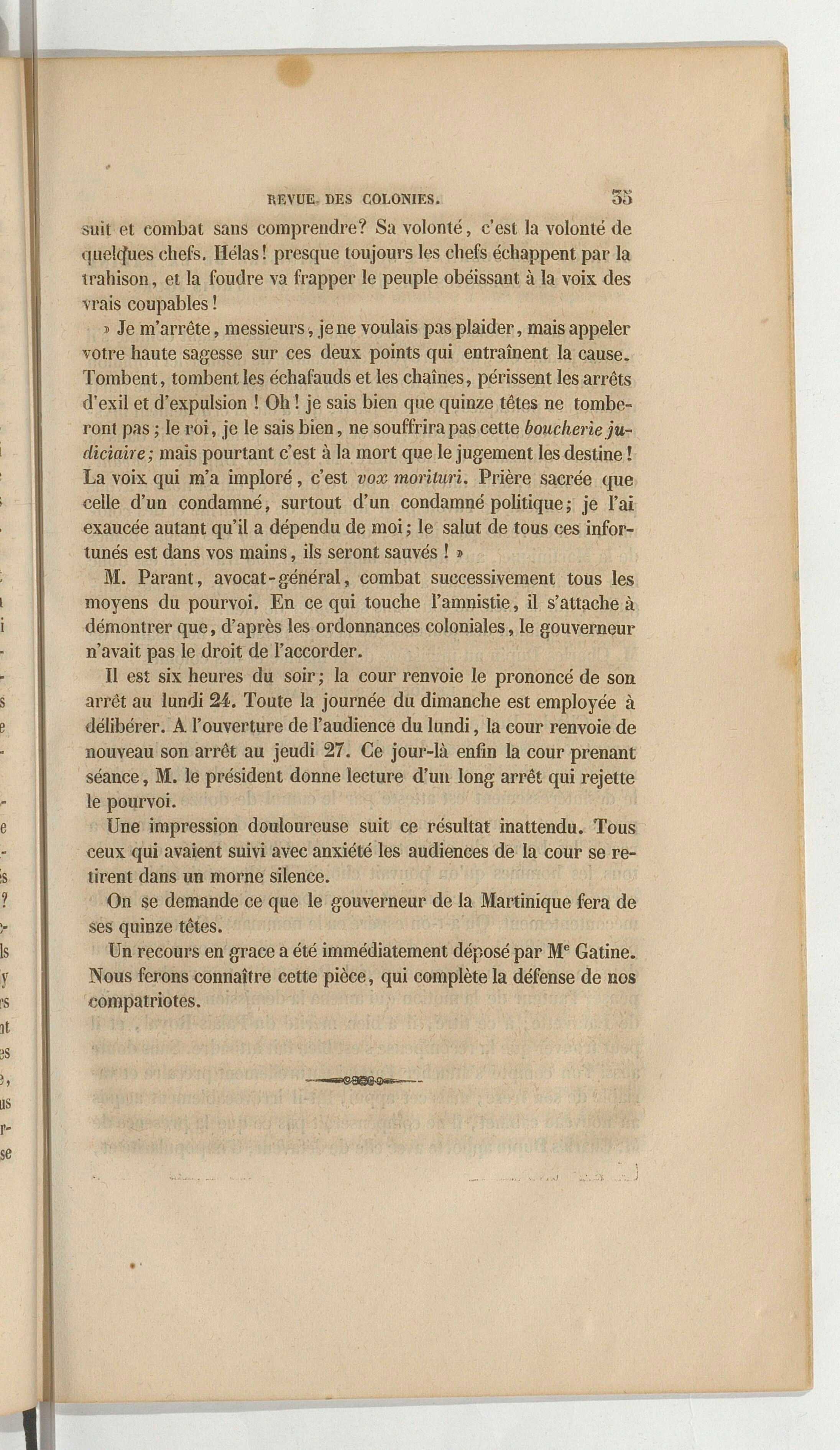 follows and fights without understanding? Its will is the will of a few chiefs. Alas! almost always the chiefs escape through betrayal, and the thunderbolt strikes the people obeying the voice of the true guilty!I stop, gentlemen, I did not mean to plead, but to call your high wisdom to these two points that carry the case. Let the scaffolds and the chains fall, let the judgments of exile and expulsion perish! Oh! I know well that fifteen heads will not fall; the king, I know well, will not suffer this judicial butchery; but nonetheless it is to death that the judgment destines them! The voice that implored me is vox morituri. Sacred is the prayer of a condemned man, especially of a political condemned; I have answered it as far as it depended on me; the salvation of all these unfortunates is in your hands, they will be saved!””M. Parant, advocate-general, contests successively all the grounds of the appeal. As regards amnesty, he seeks to demonstrate that, under the colonial ordinances, the governor did not have the right to grant it.It is six o’clock in the evening; the court postpones the delivery of its judgment to Monday 24. All day Sunday is spent deliberating. At the opening of the Monday sitting, the court again postpones its judgment to Thursday 27. On that day, finally, the court sitting, Mr. President reads a long judgment rejecting the appeal.A painful impression follows this unexpected result. All those who had followed the court’s sittings with anxiety withdraw in a bleak silence.One wonders what the governor of Martinique will do with his fifteen heads.An application for pardon was immediately filed by Mr Gatine. We shall make known this document, which completes the defense of our compatriots.