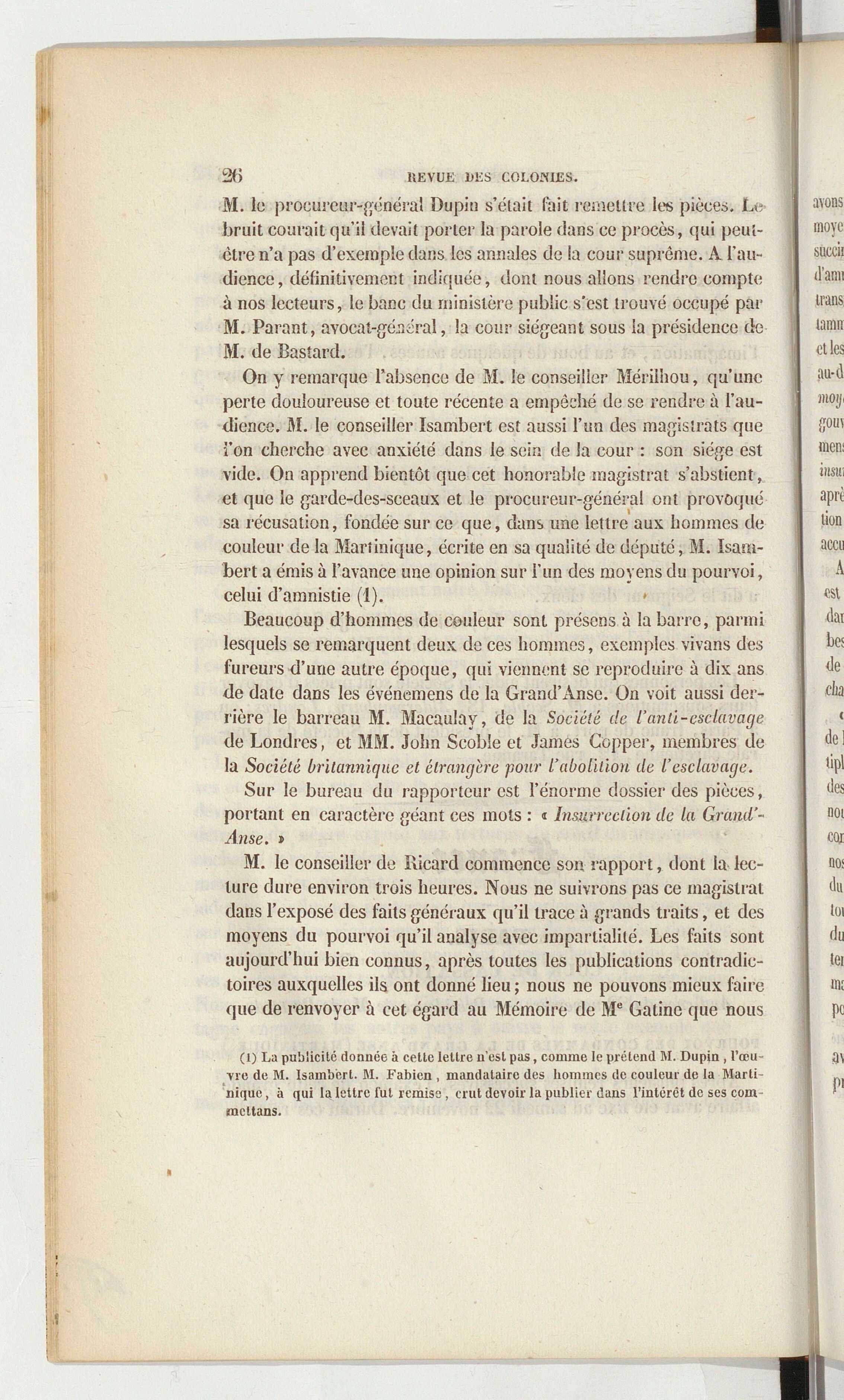 (1) The publicity given to this letter is not, as M. Dupin claims, the fault of M. Isambert. M. Fabien, representative of the men of color of Martinique, to whom the letter was delivered, believed he ought to publish it in the interest of his constituents.
