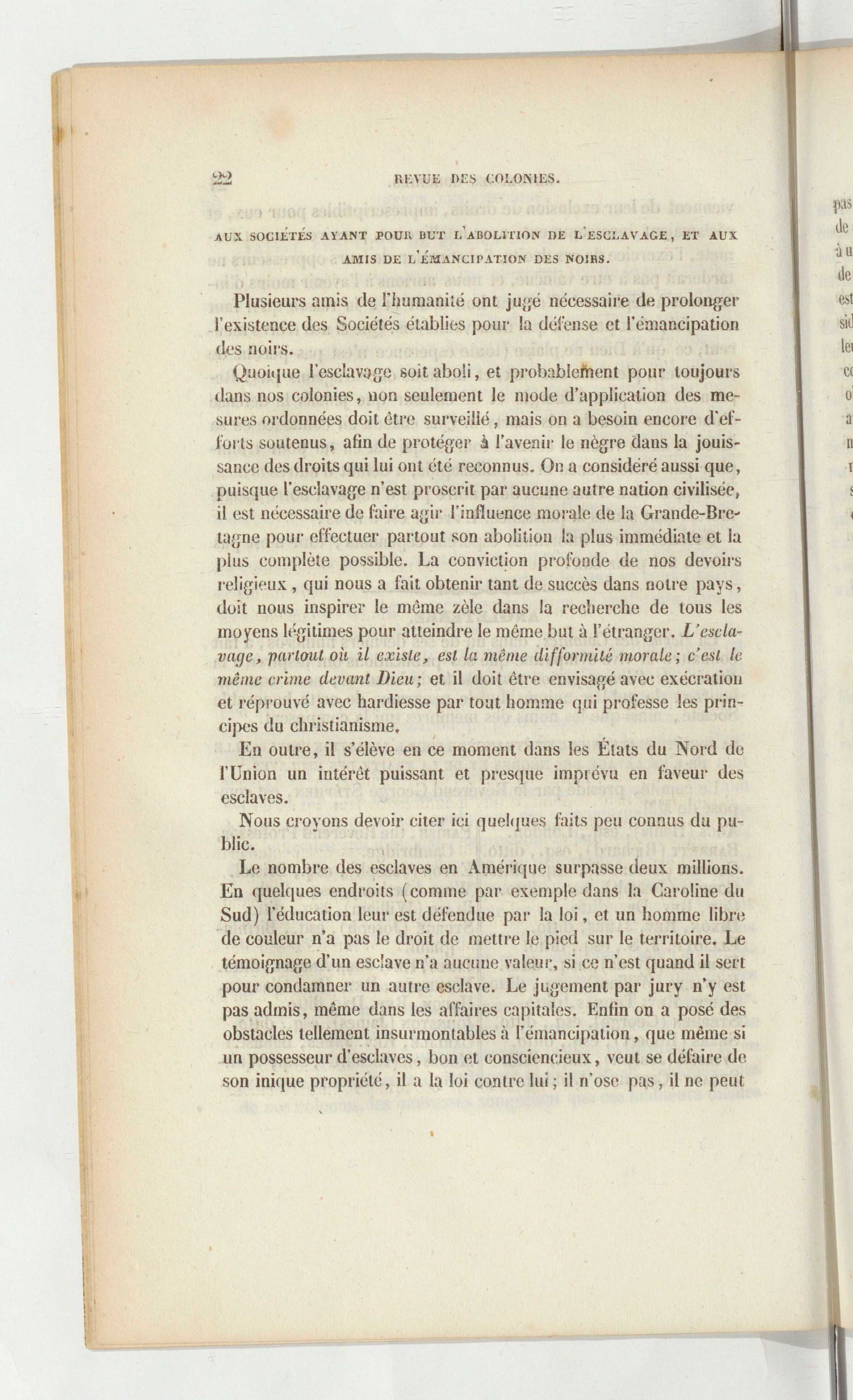 TO THE SOCIETIES WHOSE AIM IS THE ABOLITION OF SLAVERY, AND TO THE FRIENDS OF THE EMANCIPATION OF NEGROES.Several friends of humanity have deemed it necessary to prolong the existence of the societies established for the defense and emancipation of Negroes.Although slavery is abolished, and probably forever in our colonies, not only must the manner of applying the measures ordered be supervised, but sustained efforts are still needed in order to protect, in the future, the Negro in the enjoyment of the rights that have been recognized for him. It has also been considered that, since slavery is proscribed by no other civilized nation, it is necessary to bring to bear the moral influence of Great BritainGreat Britain to effect everywhere its most immediate and most complete abolition possible. The profound conviction of our religious duties, which has enabled us to obtain so much success in our own country, must inspire in us the same zeal in seeking all legitimate means to attain the same end abroad. Slavery, wherever it exists, is the same moral deformity; it is the same crime before God; and it must be regarded with execration and condemned with boldness by every man who professes the principles of Christianity.Moreover, there is rising at this moment in the Northern States of the Union a powerful and almost unforeseen interest in favor of the slaves.We believe we ought to cite here a few facts little known to the public.The number of slaves in America exceeds two millionIn some places (as for example in South Carolina) education is forbidden to them by law, and a free man of color has no right to set foot on the territory. The testimony of a slave has no value, except when it serves to convict another slave. Trial by jury is not admitted there, even in capital cases. Finally, obstacles so insurmountable have been placed in the way of emancipation that even if a slaveholder, good and conscientious, wishes to rid himself of his iniquitous property, he has the law against him; he dares not, he cannot emancipate